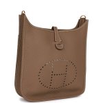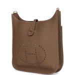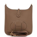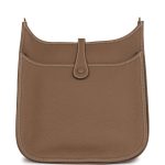 This Evelyne is in Etoupe clemence leather with gold hardware and has contrast stitching, pull tab top closure and Etoupe removable canvas and leather shoulder/crossbody strap.