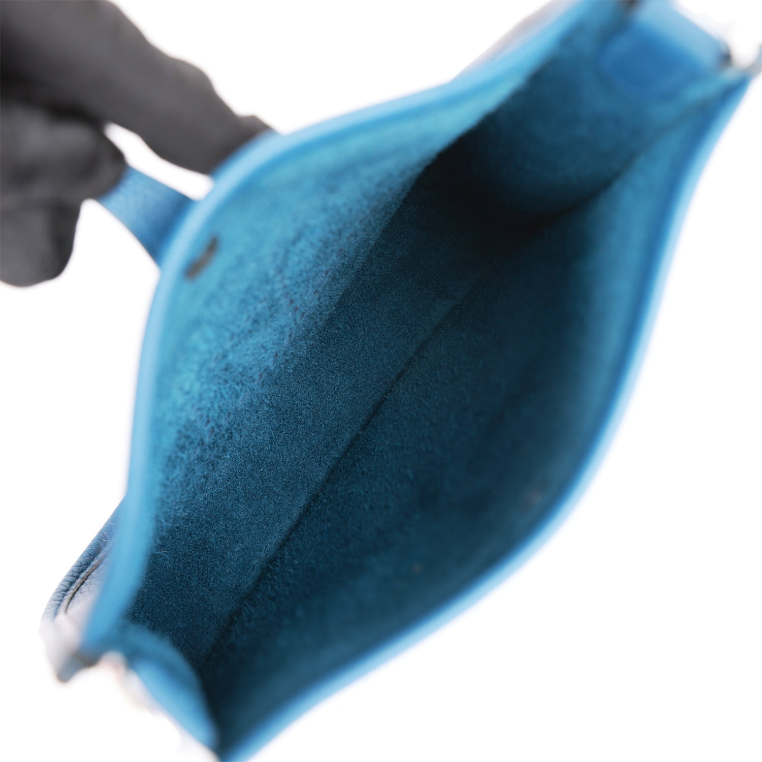 This Evelyne is in Deep Blue maurice leather with palladium hardware and has tonal stitching, pull tab top closure and a Deep Blue removable canvas and leather shoulder/crossbody strap.