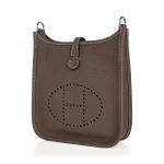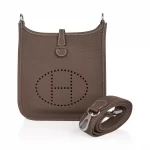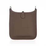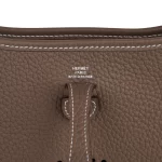 This Evelyne is in Etoupe clemence leather with gold hardware and has contrast stitching, pull tab top closure and a bleu indigo removable canvas and leather shoulder/crossbody strap.