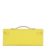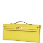 This Kelly Cut is in?Lime swift leather with gold hardware and has tonal stitching, two straps with front toggle closure and a top flat handle.