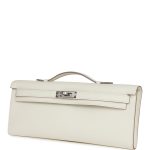 This Kelly Cut is in Mushroom swift leather with palladium hardware and has tonal stitching, two straps with front toggle closure and a top flat handle.