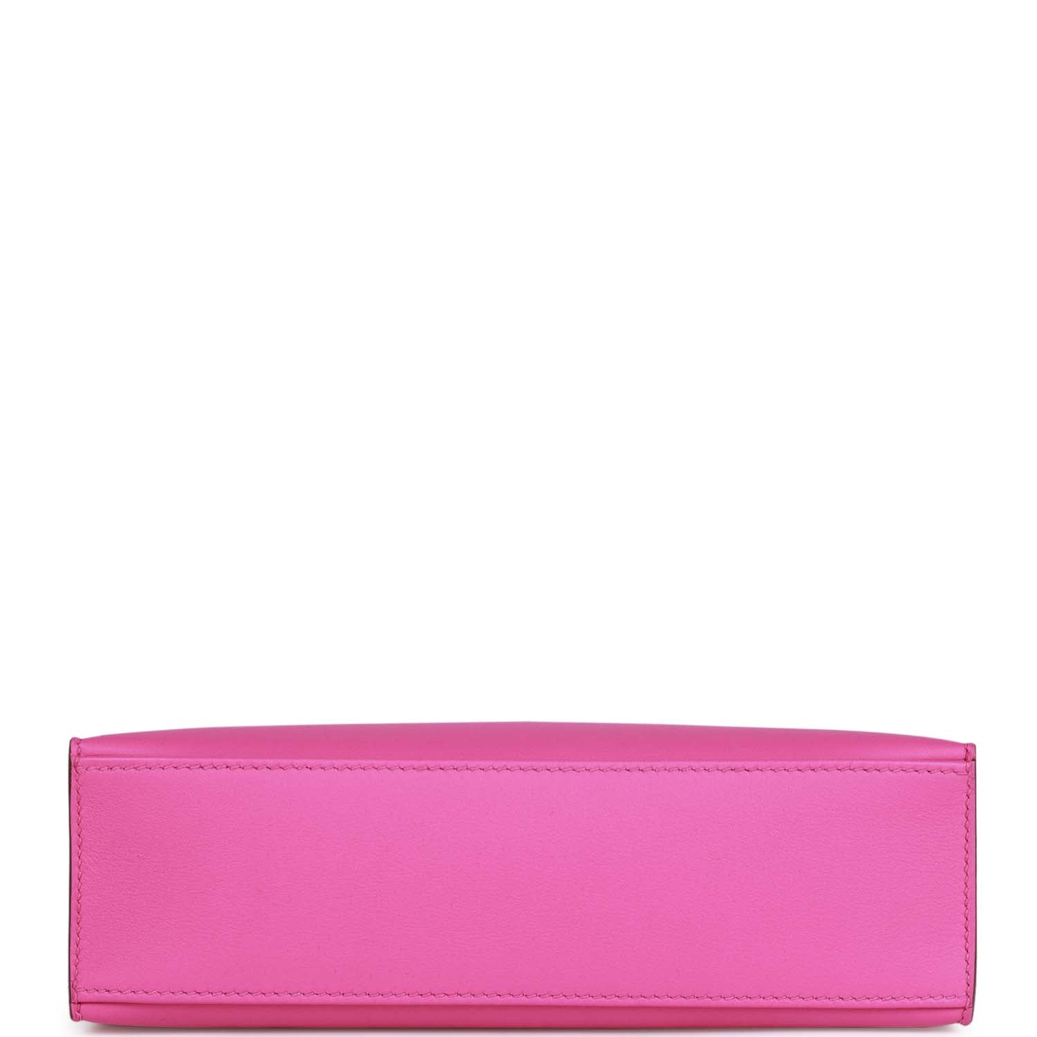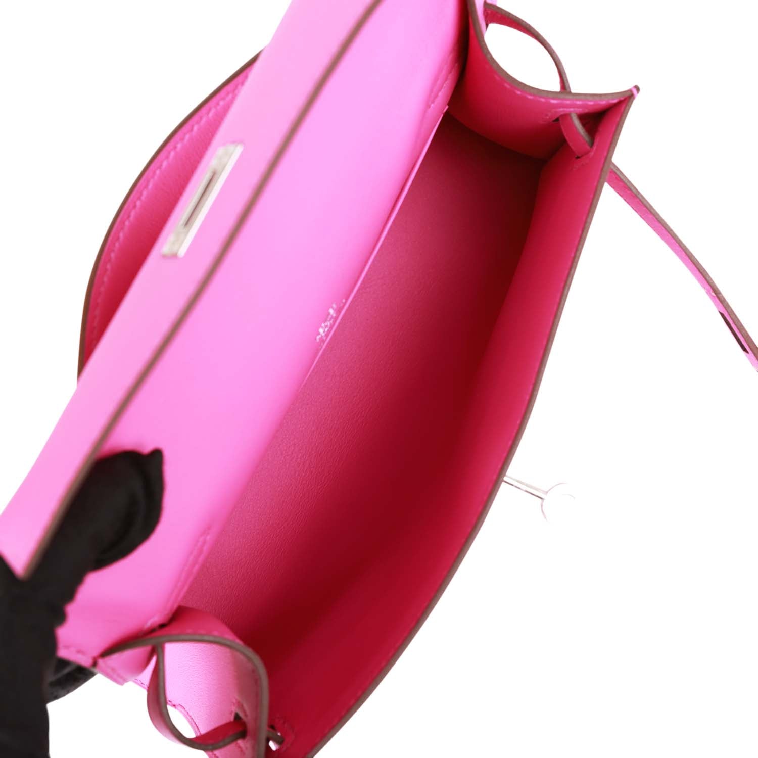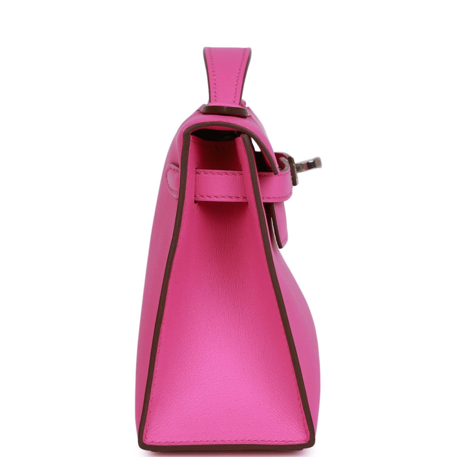 This Mini Kelly Pochette is in?Magnolia swift leather?with?palladium hardware and has tonal?stitching, front flap, two straps with?center toggle closure and a top flat handle.