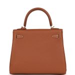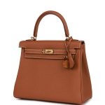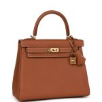 This Retourne Kelly is of gold togo leather with?gold hardware and has contrast stitching, front flap, two straps with center toggle closure, clochette with lock and two keys, single rolled handle and an optional shoulder strap.