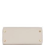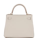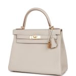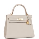 This Kelly, in the Retourne style, is in Beton togo leather with gold hardware and has tonal stitching,front flap, two straps with center toggle closure, clochette with lock and two keys, single rolled handle and removable shoulder strap.