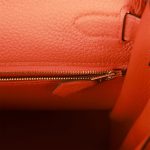 The interior is lined in Orange chevre and has one zip pocket with Hermes engraved pull and two open pockets on the opposite side.