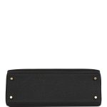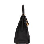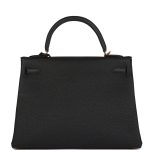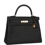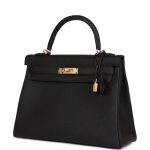 This Kelly, in the Retourne style, is in Black togo leather with gold hardware and has tonal stitching, two straps with front toggle closure, clochette with lock and two keys, single rolled handle and removable shoulder strap.