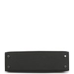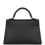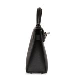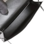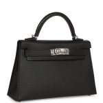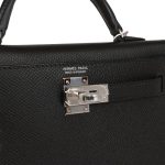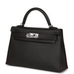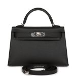 This tiny Kelly, in the Sellier style, is in black epsom leather with palladium hardware and has tonal stitching, two front straps with front toggle closure, single rolled handle and removable shoulder strap.