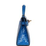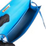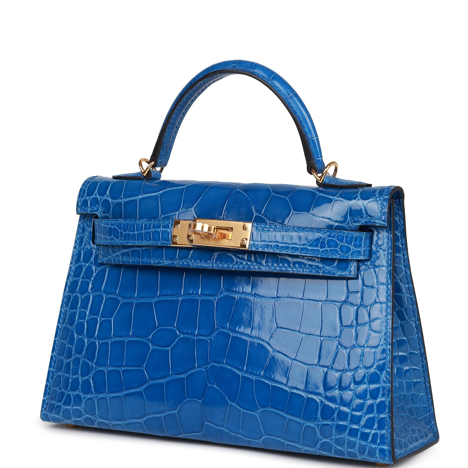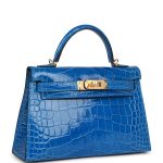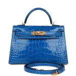 This tiny Kelly, in the Sellier style, is in Bleu Zellige shiny Mississippiensis alligator with gold hardware and has tonal stitching, two front straps with front toggle closure, single rolled handle and removable shoulder strap.