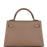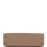 This Kelly, in the Sellier style, is in Etoupe epsom leather with palladium hardware and has contrast stitching, two straps with front toggle closure, single rolled handle and removable shoulder strap.