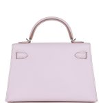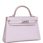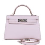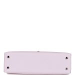 This Kelly, in the Sellier style, is in Mauve Pale epsom leather with palladium hardware and has tonal stitching, front flap, two straps with center toggle closure, single rolled handle and removable shoulder strap.