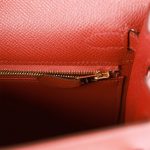 The interior is lined with?Rouge?Venetian chevre leather and has one zip pocket with an Hermes engraved pull and one open pocket on the opposite side.