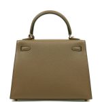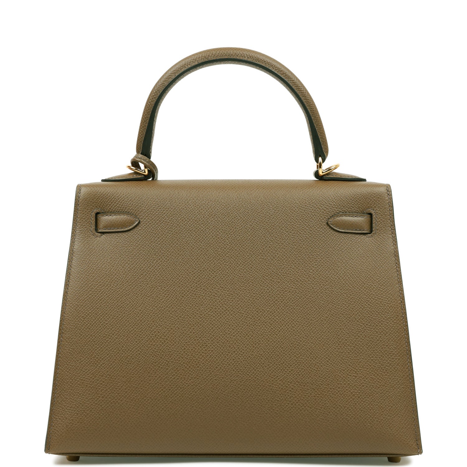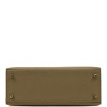 This Sellier Kelly is of Vert Olive epsom leather with gold hardware and has tonal stitching, front flap, two straps with center toggle closure, clochette with lock and two keys, single rolled handle and an optional shoulder strap.