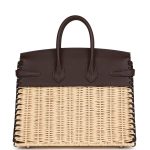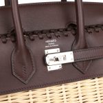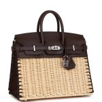 This rare Picnic Birkin Bag is in Rouge Sellier swift leather and Osier wicker with palladium plated hardware and has tonal stitching, front flap, two straps with toggle closure and double top handles.