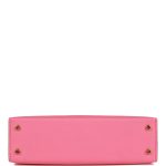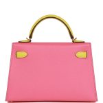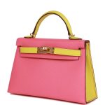 This tiny Horseshoe Stamp Kelly, in the Sellier style, is in Rose Azalee and Lime epsom leather with gold hardware and has tonal stitching, two front straps with front toggle closure, single rolled handle and removable shoulder strap.