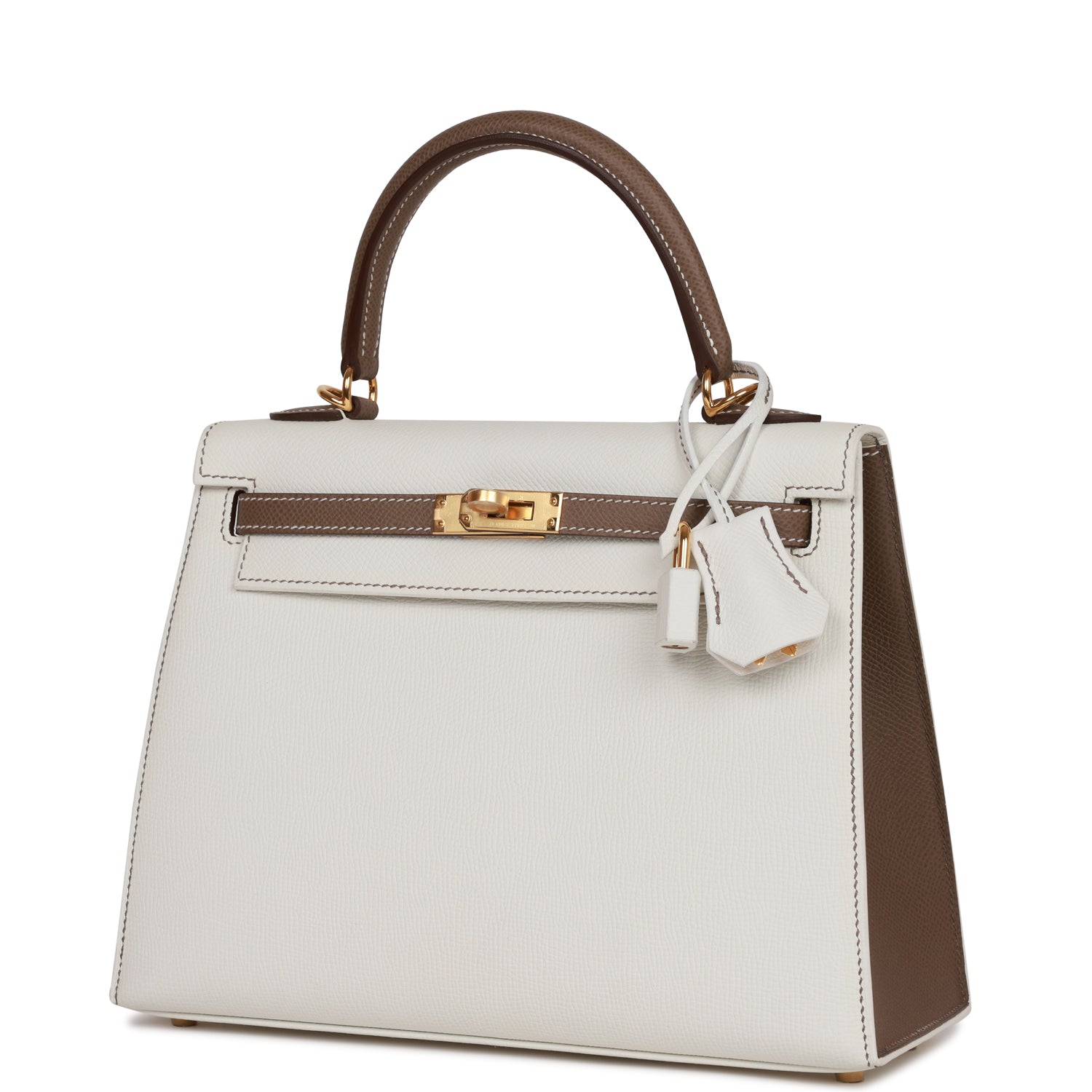 This Special Order Kelly, in the Sellier style, is in White and Etoupe epsom leather with gold hardware and has contrast stitching, two front straps with toggle closure, clochette with lock and two keys, single rolled handle and removable shoulder strap.