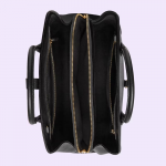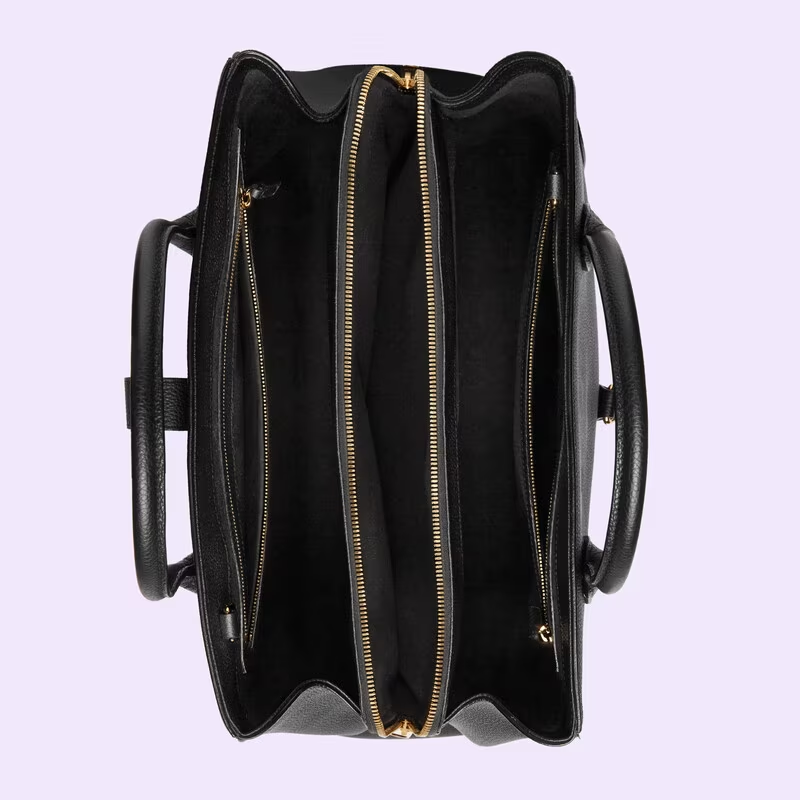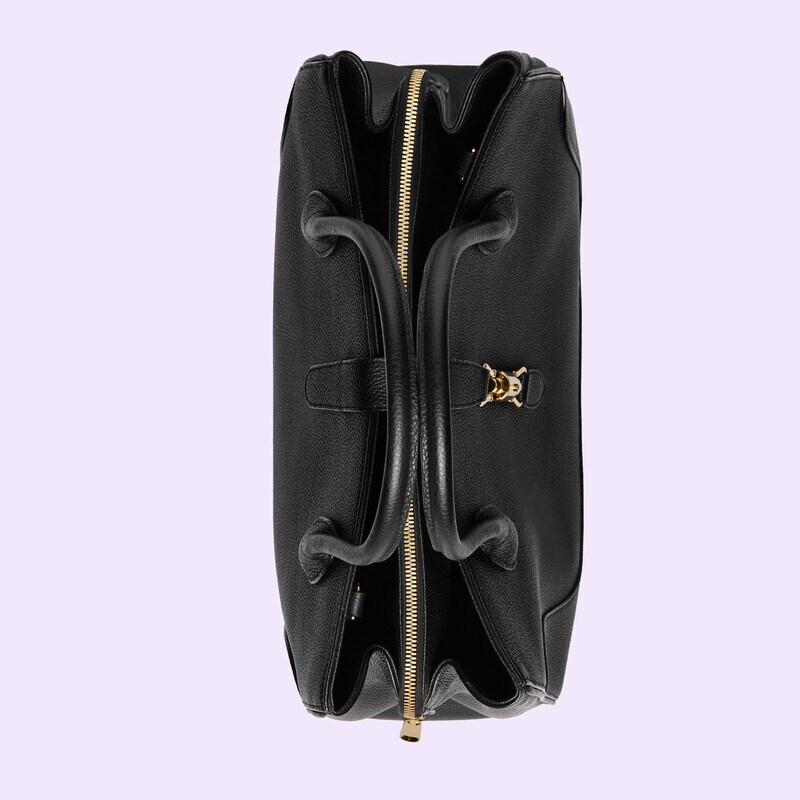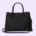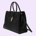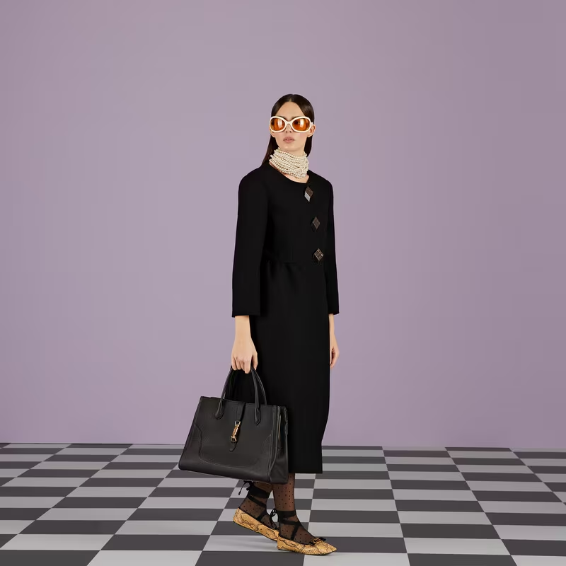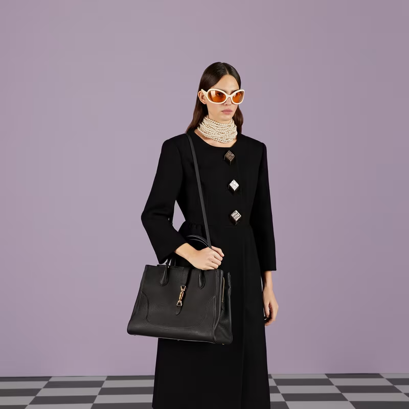 The world of Jackie 1961 is enriched with a medium tote bag finished with a detachable shoulder strap. Presented in natural grain leather in a classic black hue, the medium sized style is defined by the emblematic piston closure.