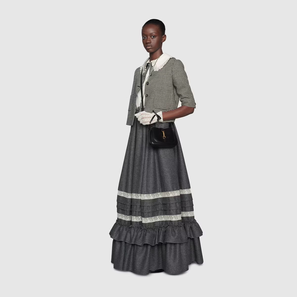 The reintroduction of the Jackie bag in a mini size for Fall Winter 2020 presents a new take on a historical Gucci icon. Brought back to the forefront, the recognizable shape is presented in black leather and enhanced with an additional, detachable shoulder strap. Attached to the bag with a buckle closure, the second strap adds a contemporary feel to the archival style, providing new ways to wear—from top handle, shoulder to cross body. The Jackie 1961: available exclusively in Gucci stores and on Gucci.com