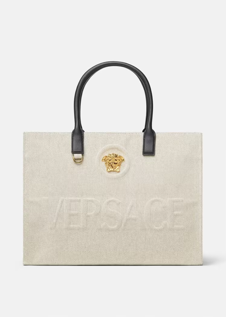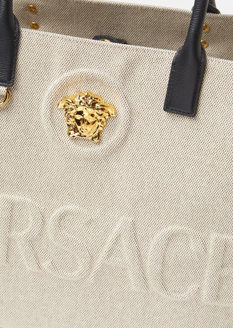 Crafted from canvas, this tote bag is adorned with a central La Medusa plaque and tonal debossed Versace logo lettering. The contrasting top handles are crafted from leather, and the spacious interior has two zipped pockets and a protector strap.