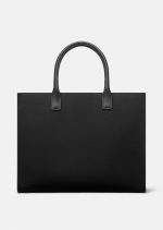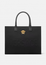 Crafted in tonal canvas with leather top handles, this classic tote bag is adorned with a Medusa plaque and raised Versace logo lettering. The roomy interior has a large zipped pocket and protector strap. Attach a Versace bag charm with the D-ring for an added touch of style.