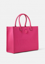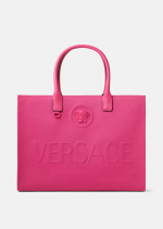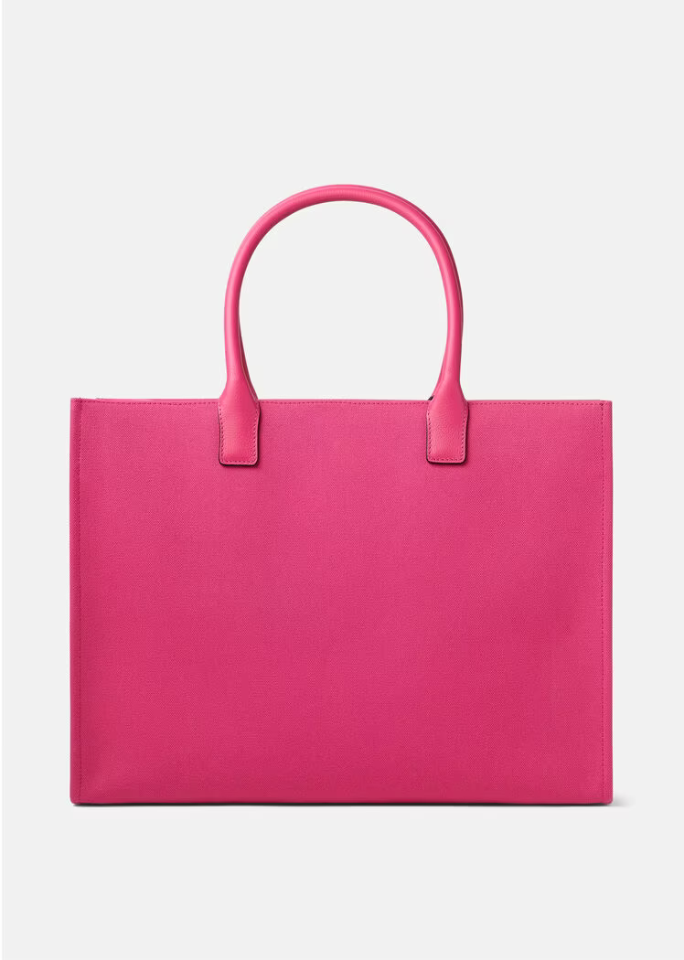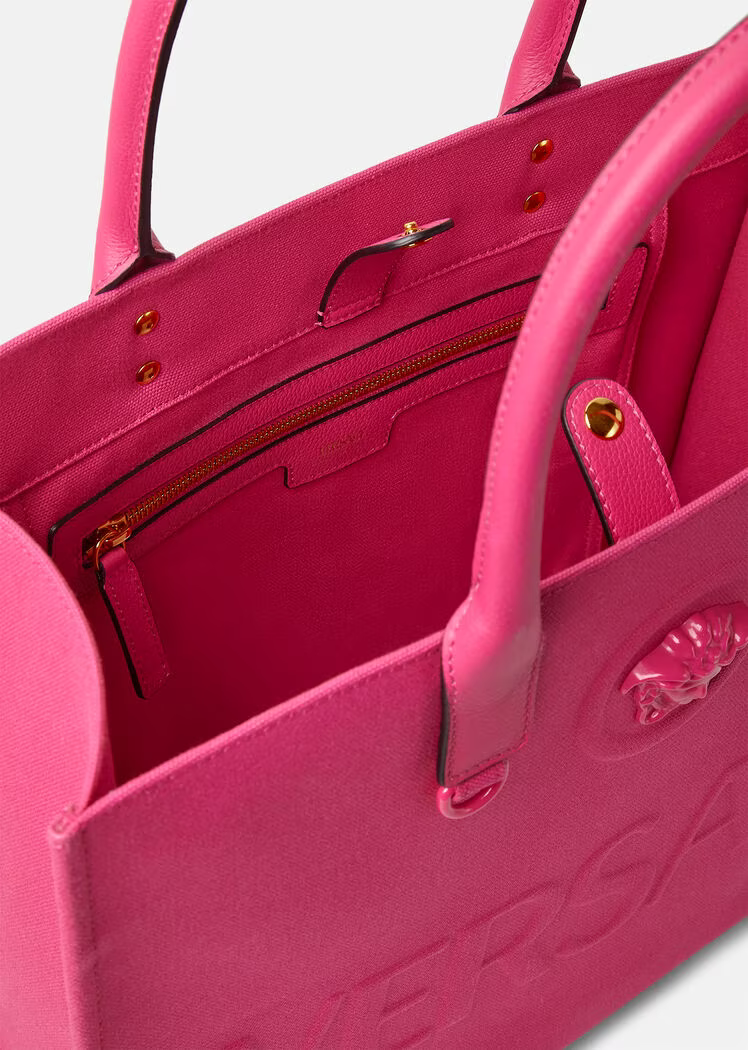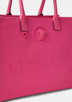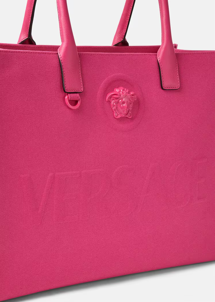 Crafted in tonal canvas with leather top handles, this classic tote bag is adorned with a Medusa plaque and raised Versace logo lettering. The roomy interior has a large zipped pocket and protector strap. Attach a Versace bag charm with the D-ring for an added touch of style.
