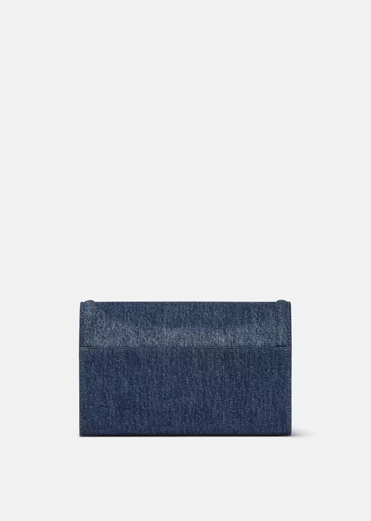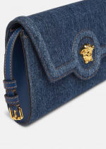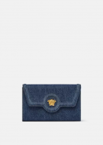 A versatile design, this crossbody bag is crafted from denim and adorned with a three-dimensional La Medusa plaque. It functions as a large wallet with multiple note and card slot compartments, and can be worn crossbody or over the shoulder with the detachable strap.