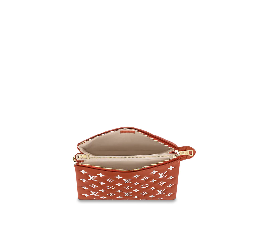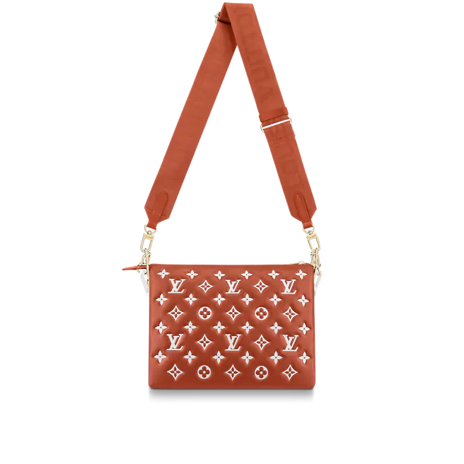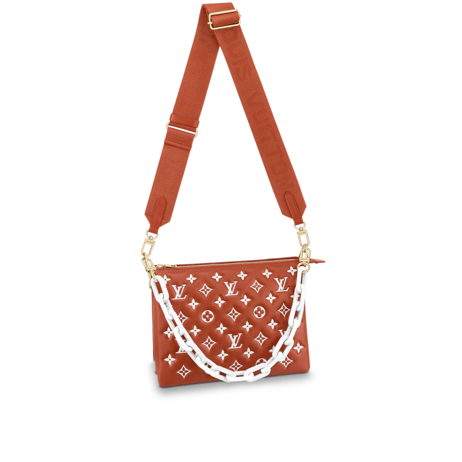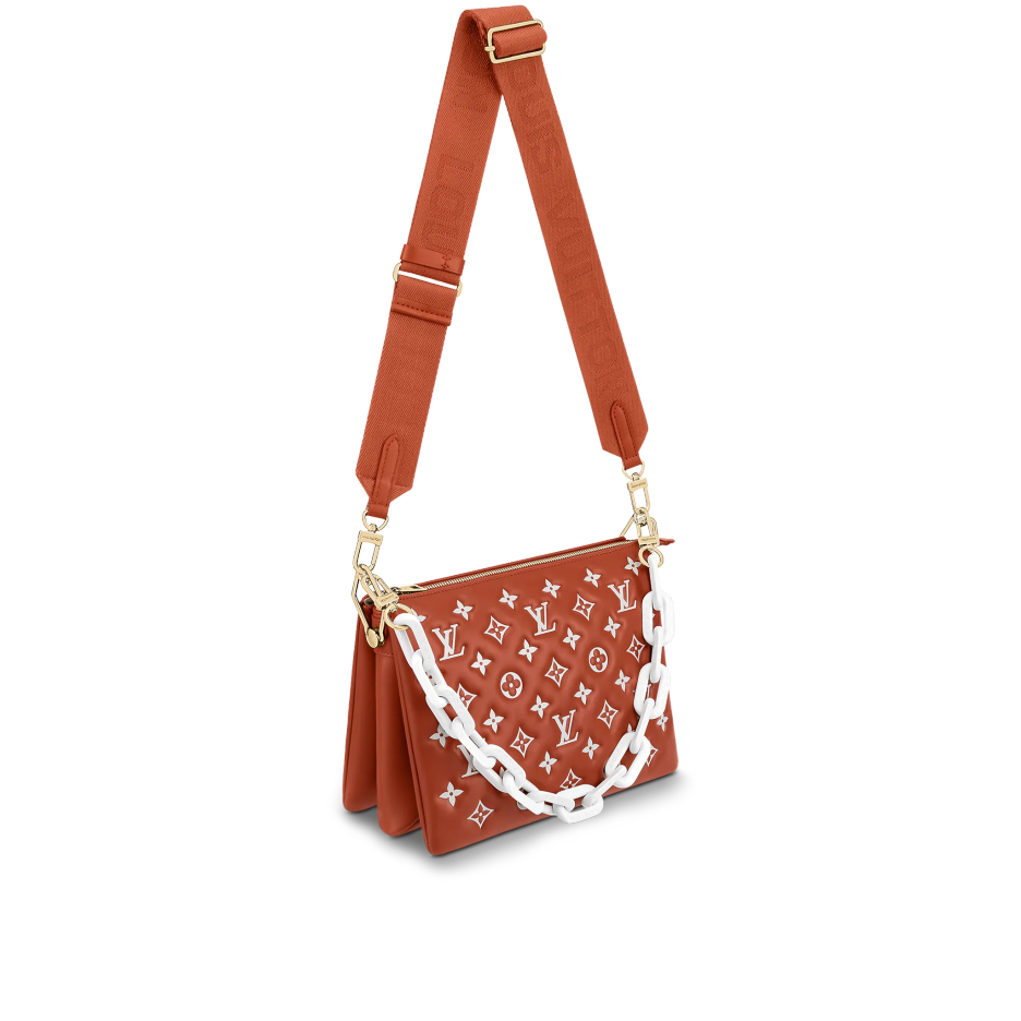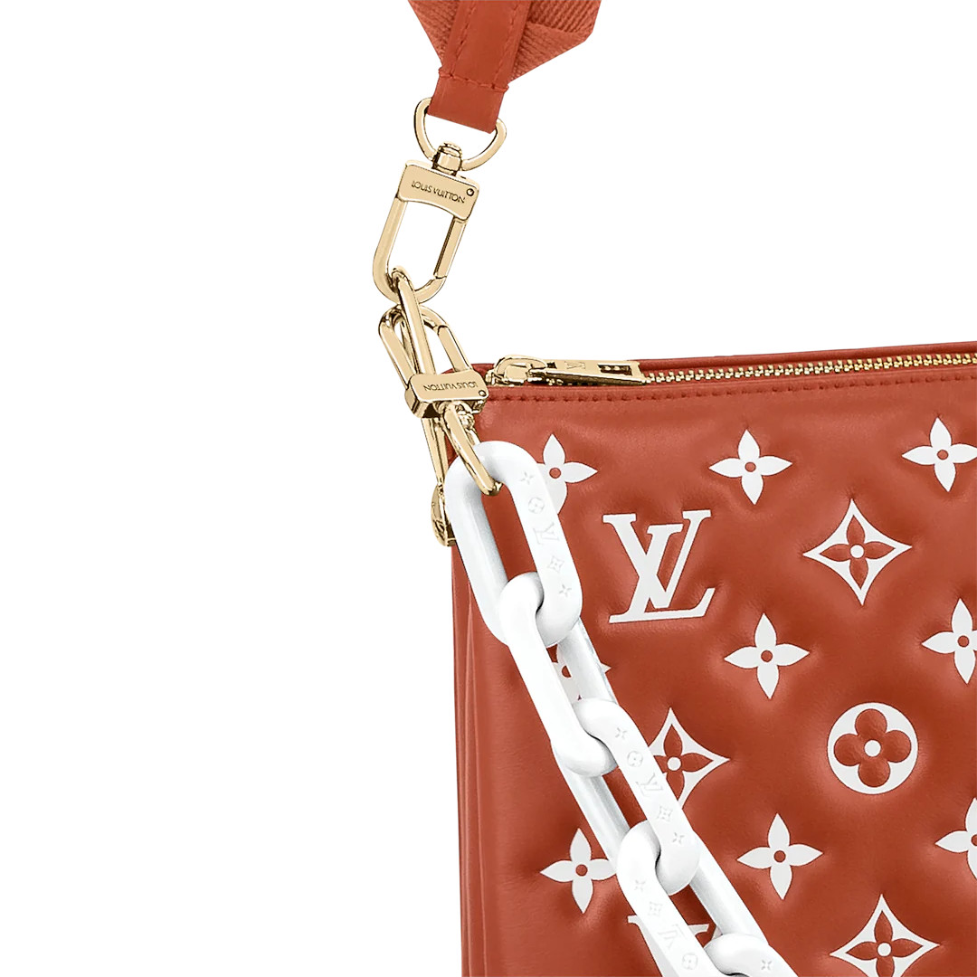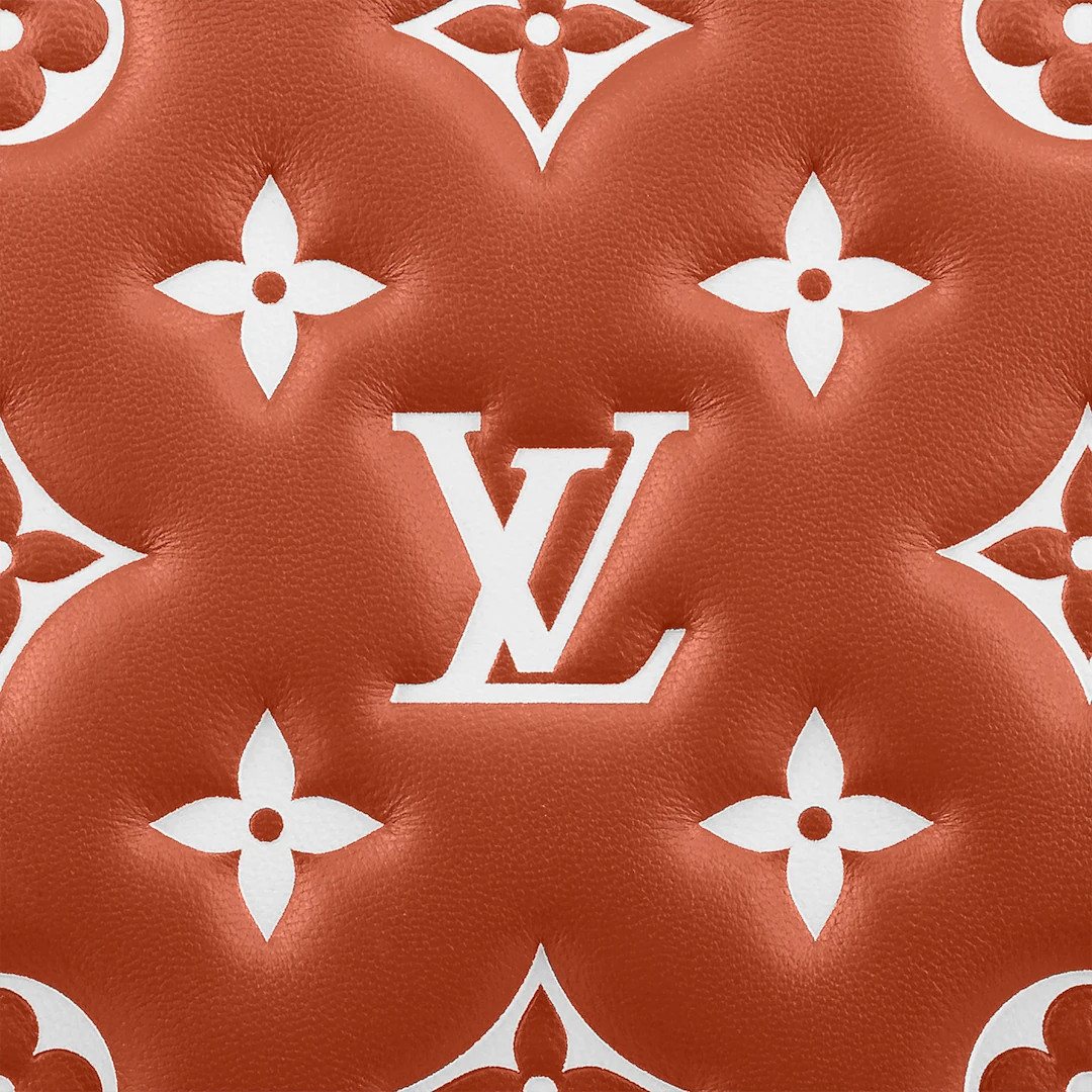 The Coussin PM is a vibrantly colored tennis bag reminiscent of the world of tennis. The body is made of puffed lamb leather embossed with a Monogram pattern and a contrasting white acetate chunky chain that recalls the white lines of a tennis court.