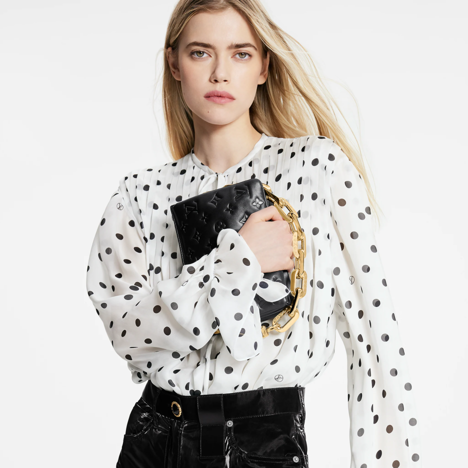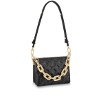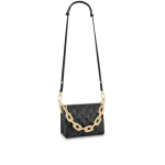 The Coussin BB has the softest cushion-like texture. The Coussin BB is made of puffed lamb leather embossed with a Monogram pattern in a lovely compact size. The chunky gold-colored chain and slender leather strap are both detachable