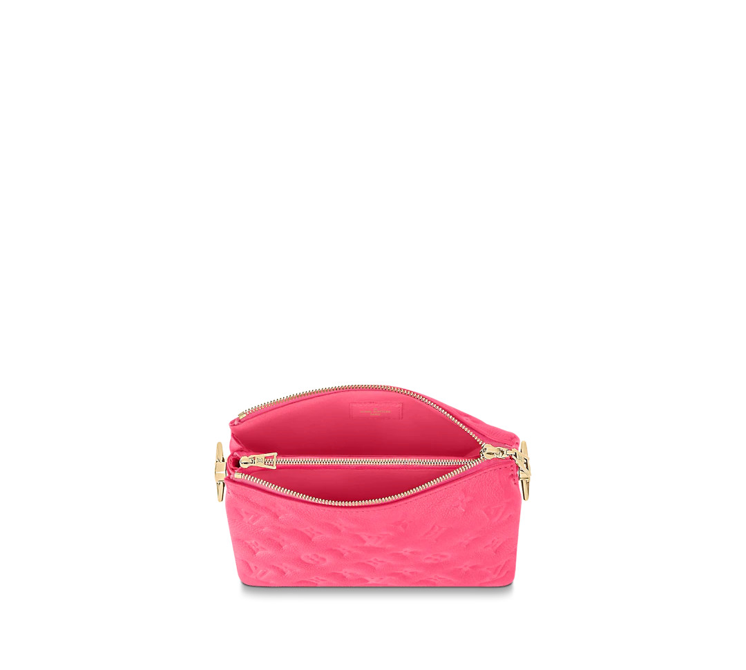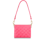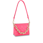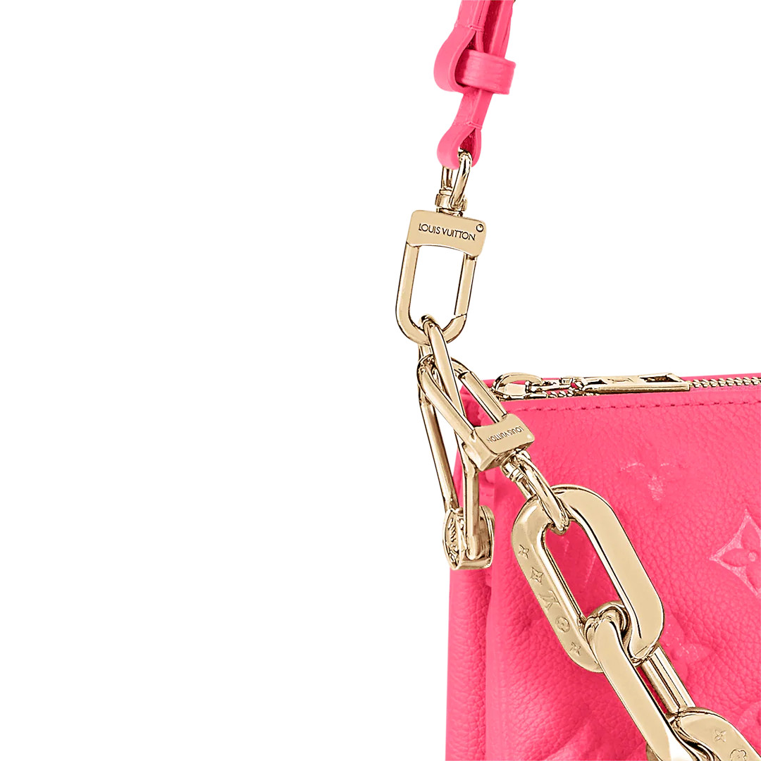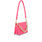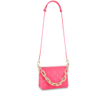The Coussin BB is part of the LV Rose Fluo capsule collection by Nicolas Ghesquière. It is finished in eye-catching fluorescent pink calf leather embossed with a Monogram pattern. A chunky gold-colored chain and pink leather shoulder strap complement