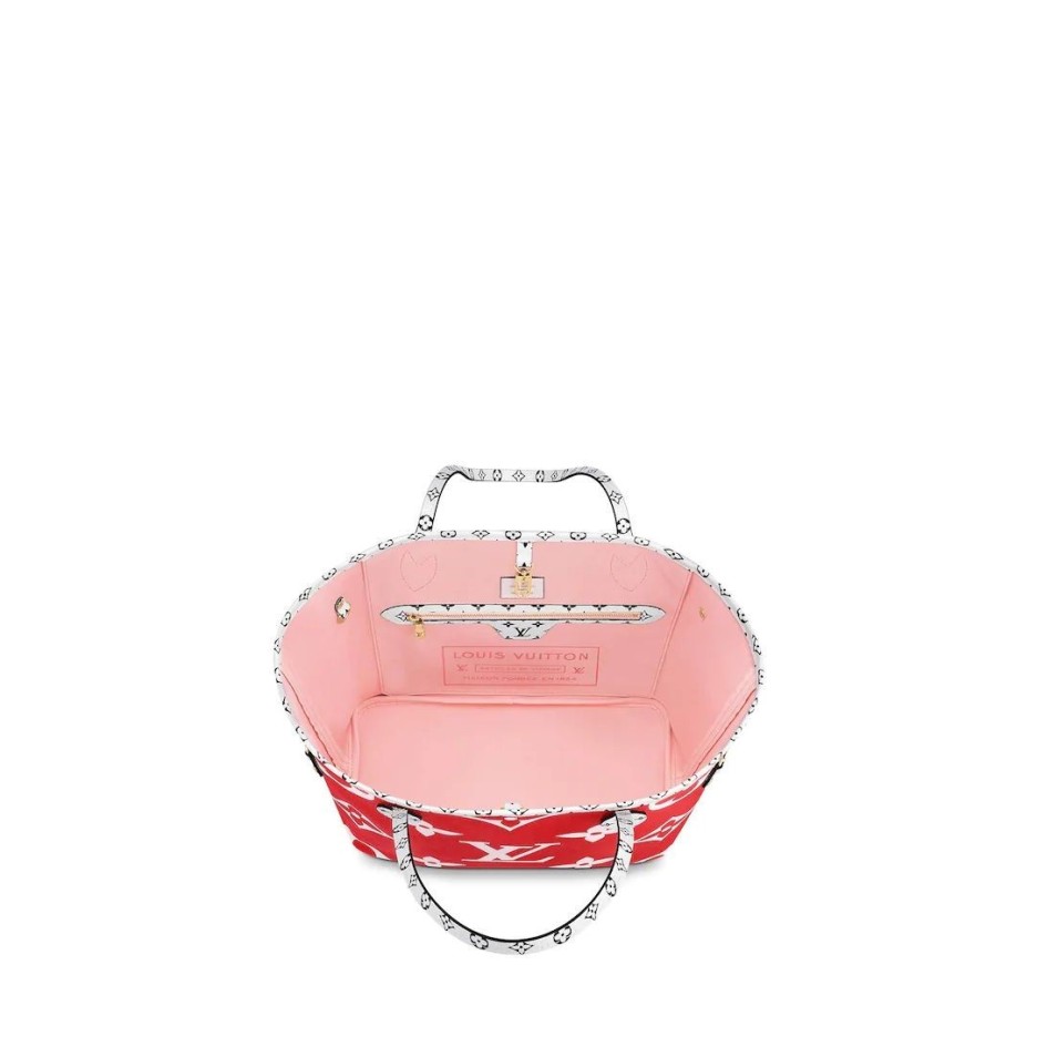 Playful, colorful, Neverfull: this season the iconic carryall wears a bold new spin on Monogram canvas. XL and Mini versions of the signature motif combine in sunny color palettes for a fun, summery look. Worn over the shoulder or carried on the arm, this MM model pairs perfectly with both beach and city looks.