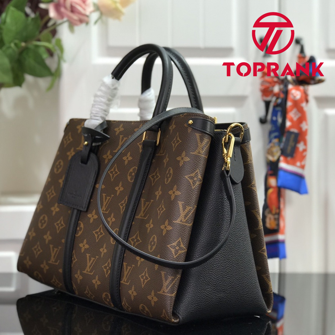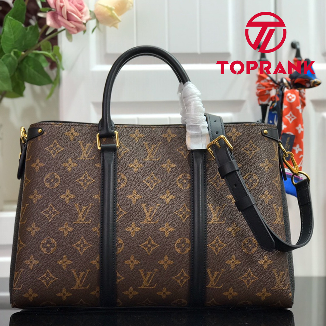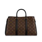 An elegant choice for city wear, this edition of the Soufflot MM in supple Monogram canvas is richly accented with colored leather gussets and trim. The lateral bands and name tag nod to the Keepall, a House icon since 1934. Articulated top handles and a long, adjustable strap afford multiple carry options, while the coordinated colored lining adds refinement.