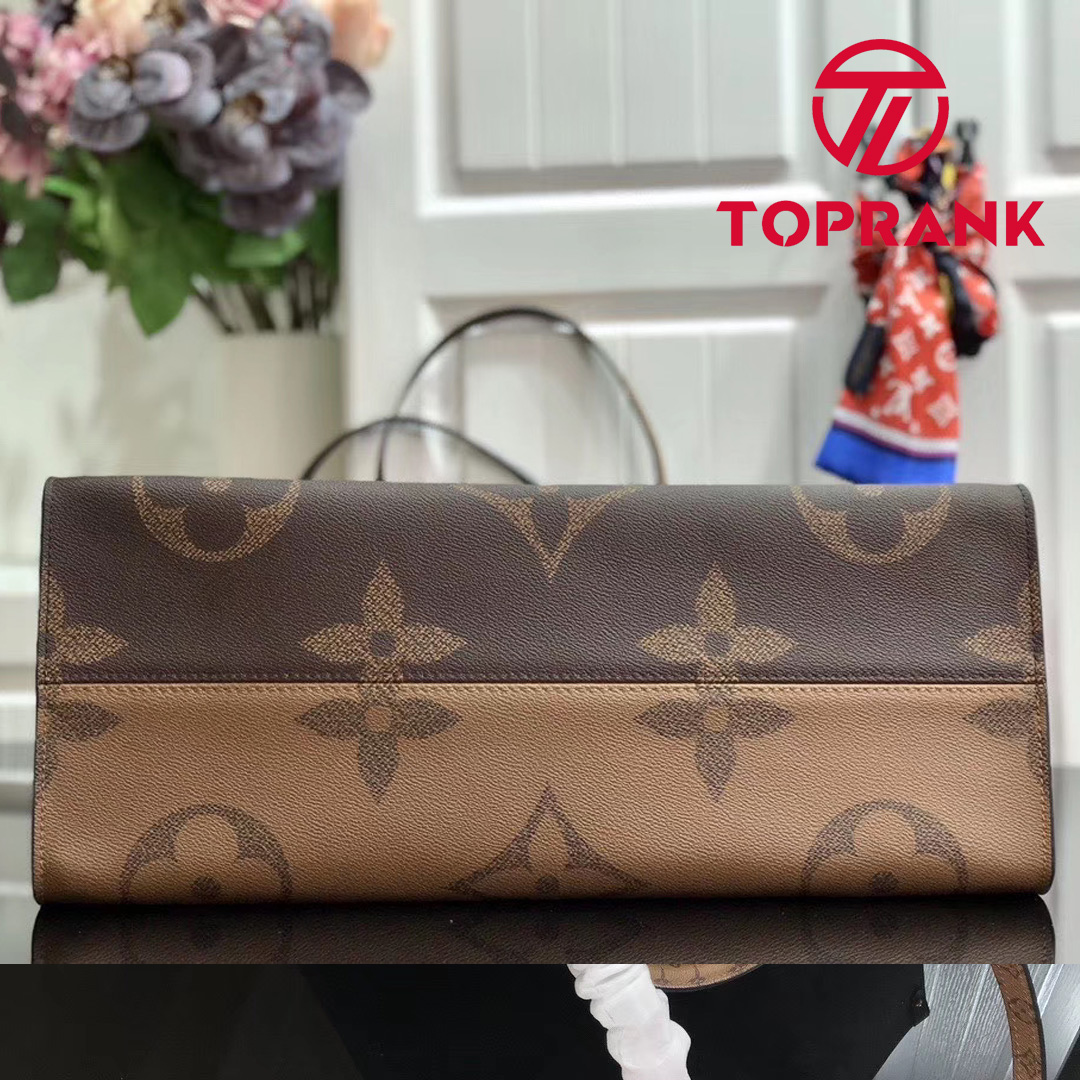 The name says it all: Onthego MM takes care of business or shopping, with plenty of room for a busy woman’s essentials. With classic Monogram canvas on one side and Monogram Reverse on the other, it is virtually two bags in one. Twin Toron top handles and two shoulder straps offer several different carry styles, for extra versatility.