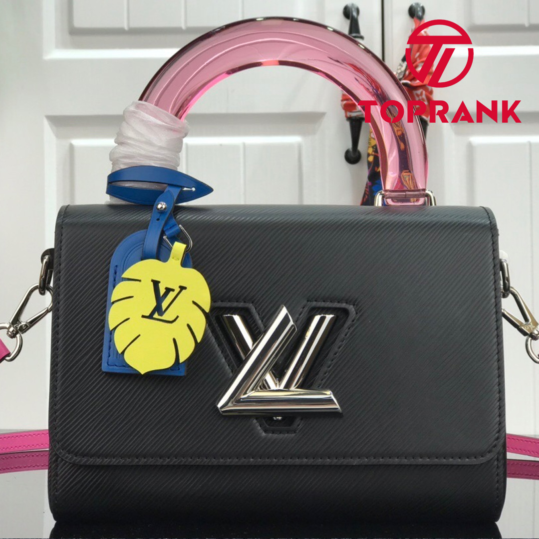 Transforming a classic bag into something bold and colorful for Summer 2020, Louis Vuitton fashions the Twist MM in deep-dyed Epi leather with a colored plexiglass top handle and bright-colored nametag and charm. Accented by the classic LV Twist lock, the sheer top handle is associated with a removable leather strap for allow added carrying options.