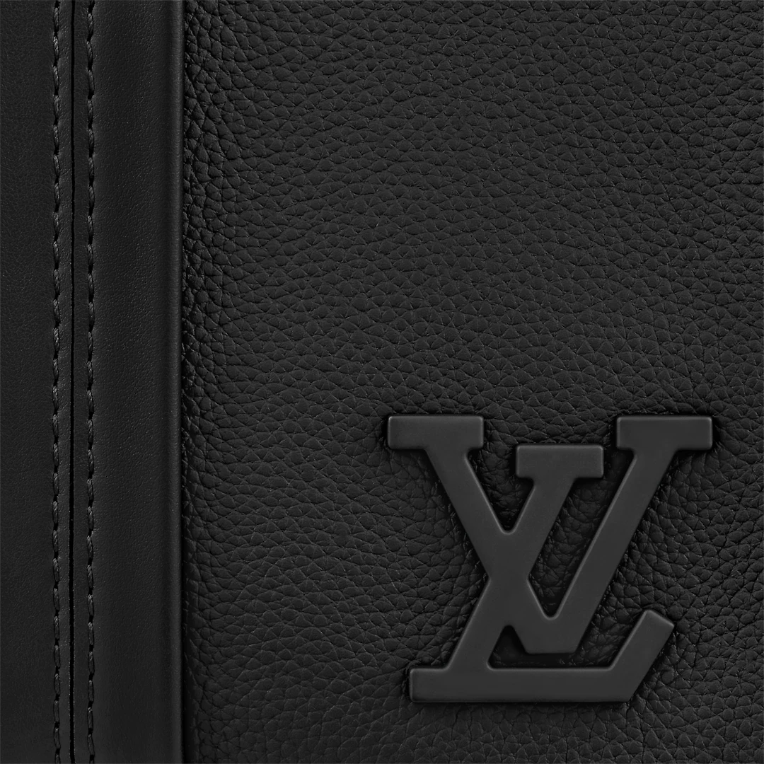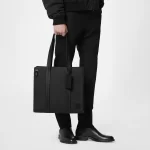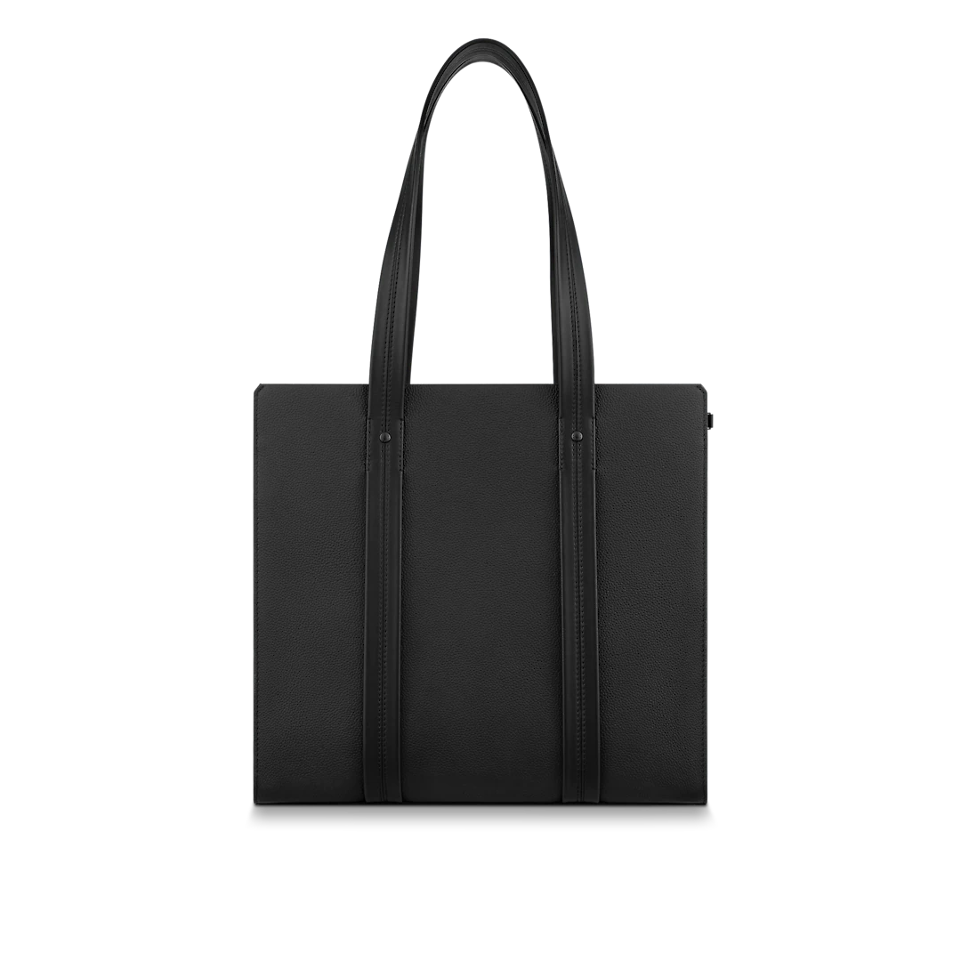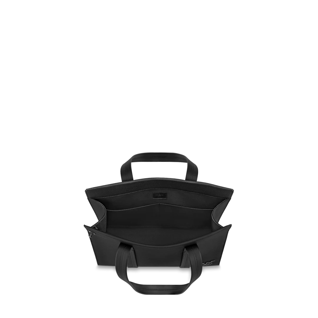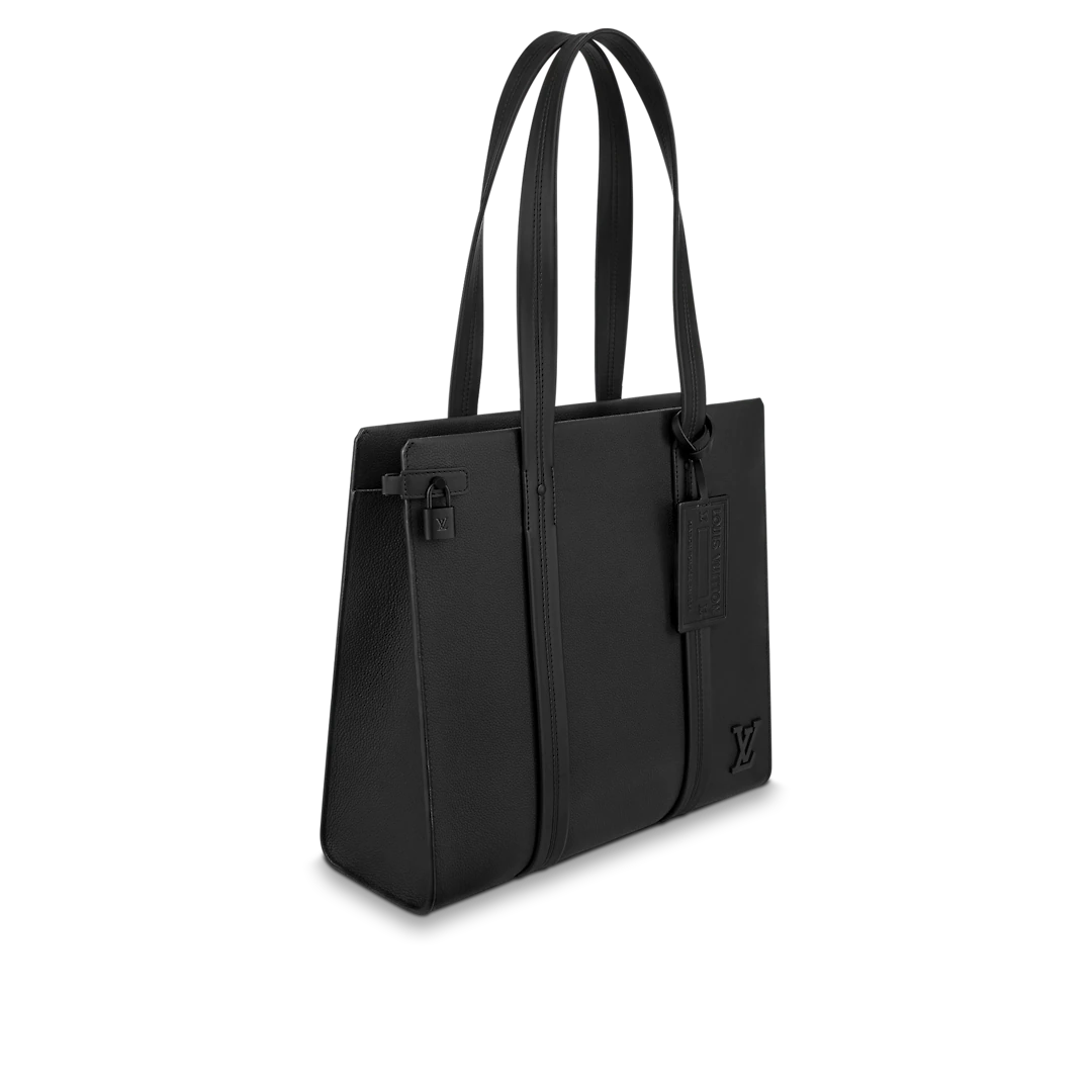 Styled in soft, finely grained black calf leather, the LV Aerogram Takeoff Tote is a practical and elegant outsized bag. Its minimalist design is sure to appeal to the fashion-conscious man who appreciates subtle signature touches like the leather tag and LV initials in black metal. And it has a lockable compartment to keep a laptop and other valuables secure.