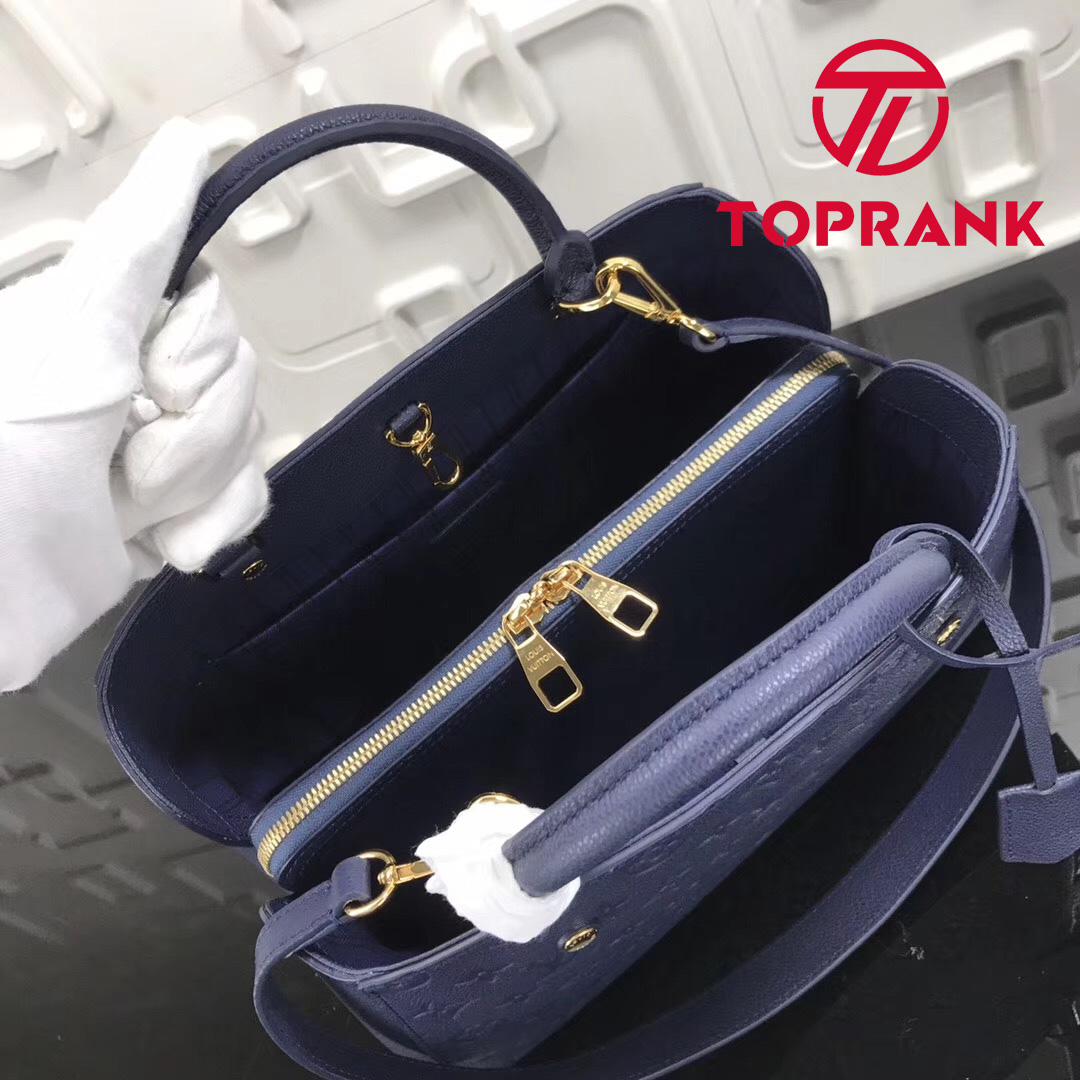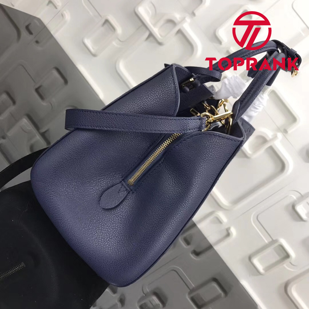 33 x 23 x 15 cm (Length x height width ) •Golden color metallic pieces•Shoulder strap for hand or shoulder carry options•Smooth calf leather trim•Striped textile lining•1 central interior zipped compartment with padlock signature•2 wide interior functional compartments•1 double smartphone pocket•1 large flat pocket