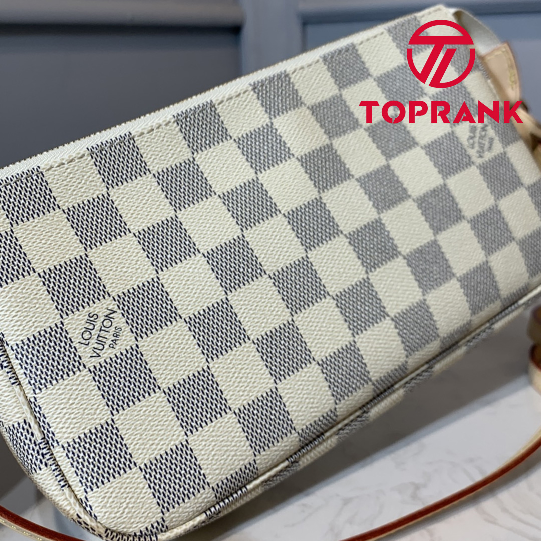 Damier Azur canvas gives the iconic shape of the Pochette Accessoires a bright, alluring appeal. Slightly larger than the original design, it can easily accommodate a Zippy wallet.
