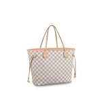 The Neverfull MM tote unites timeless design with heritage details. Made from fresh Damier Azur canvas with natural cowhide trim, it is roomy yet not bulky, with side laces that cinch for a sleek allure or loosen for a casual look. The slim leather handles slip easily over the shoulder or arm. Lined in colorful textile, it features a removable pouch which can be used as a clutch or an extra pocket.
