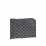 Modern and stylish in Damier Graphite canvas, Louis Vuitton’s Pochette Jour features a wide zipped opening and a discreet gusset to further increase its capacity. It can carried in the hand or slipped inside a larger bag.10.6 x 7.9 inchesL-zip closure6 CC slots1 flat inside pocket1 gussetFits an iPad MiniDamier Graphite coated canvasTextile liningSilver color metallic pieces