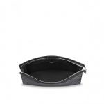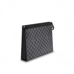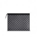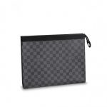 The Pochette Voyage in Damier Graphite canvas is a smart, structured pouch that can be used for a variety of purposes. It can be carried in the hand for a stylish look, or slipped inside a larger bag when traveling. It is large enough to hold a laptop and contains a pocket and credit card slots.