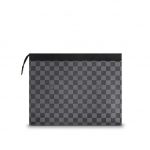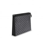 The Pochette Voyage in Damier Graphite canvas is a smart, structured pouch that can be used for a variety of purposes. It can be carried in the hand for a stylish look, or slipped inside a larger bag when traveling. It is large enough to hold a laptop and contains a pocket and credit card slots.