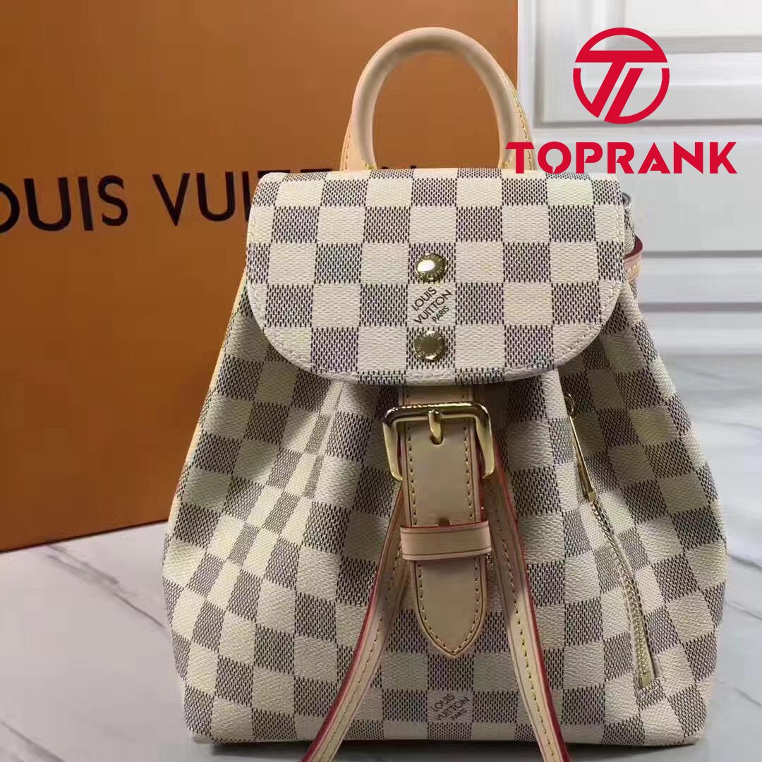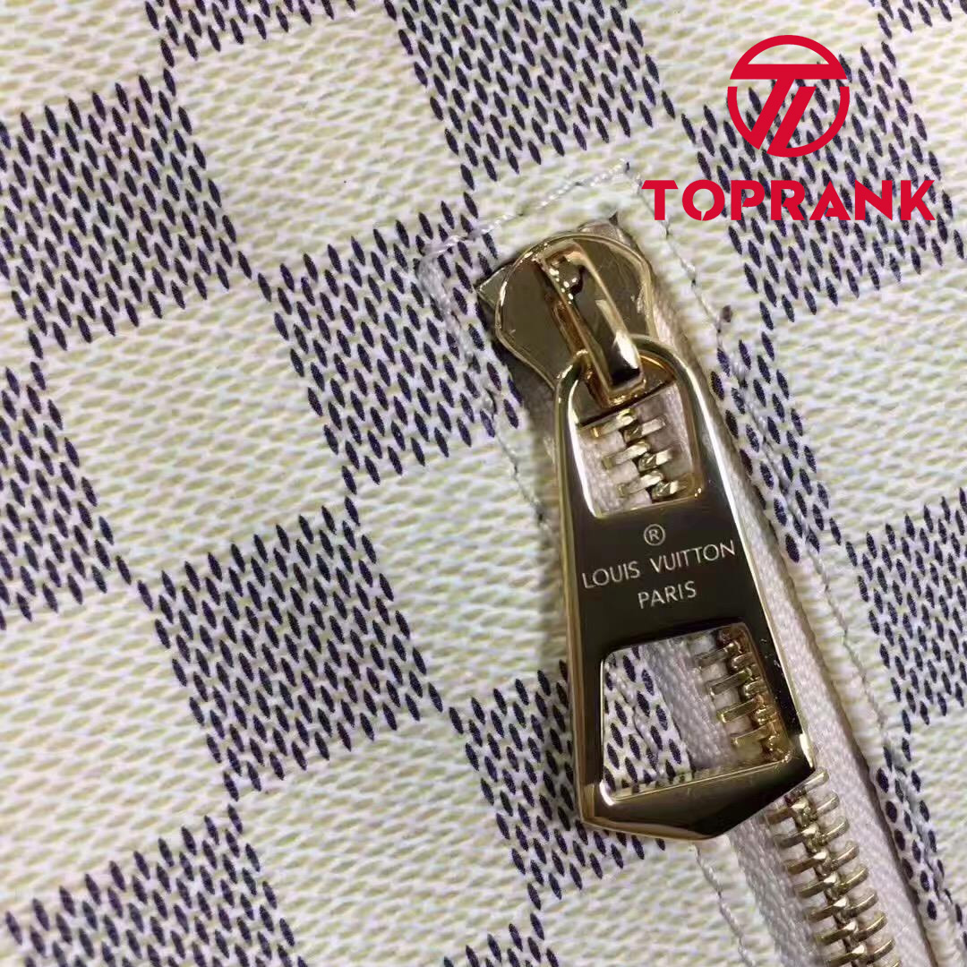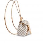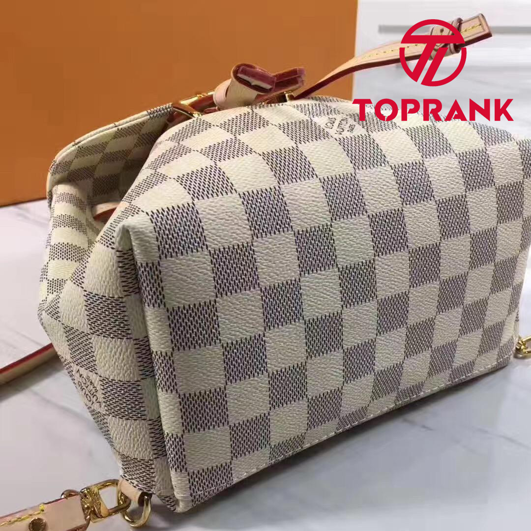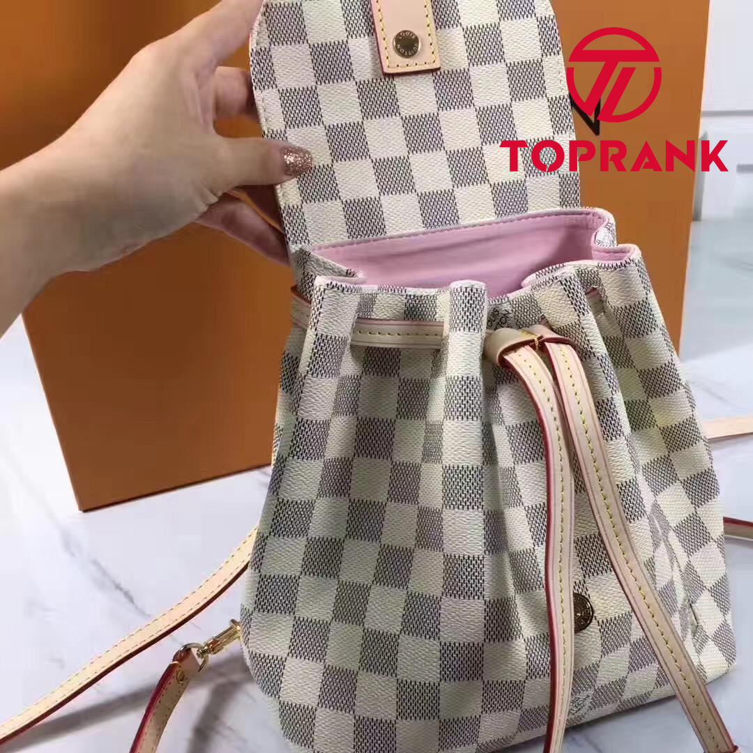 18.5 x 28 x 11.5 cm (Length x heightx width ) •7.3 x 11 x 4.5 inches•Damier Azur coated canvas exterior•Rose Ballerine microfiber lining•Natural cowhide leather trim•Shiny Gold colored metallic pieces•Puffed handle•2 adjustable flat shoulder / cross•body straps•Drawstring top closure secured by a flap and prong buckle closing system with magnet•Exterior zipped pocket•Interior smartphone pocket•Interior D•ring