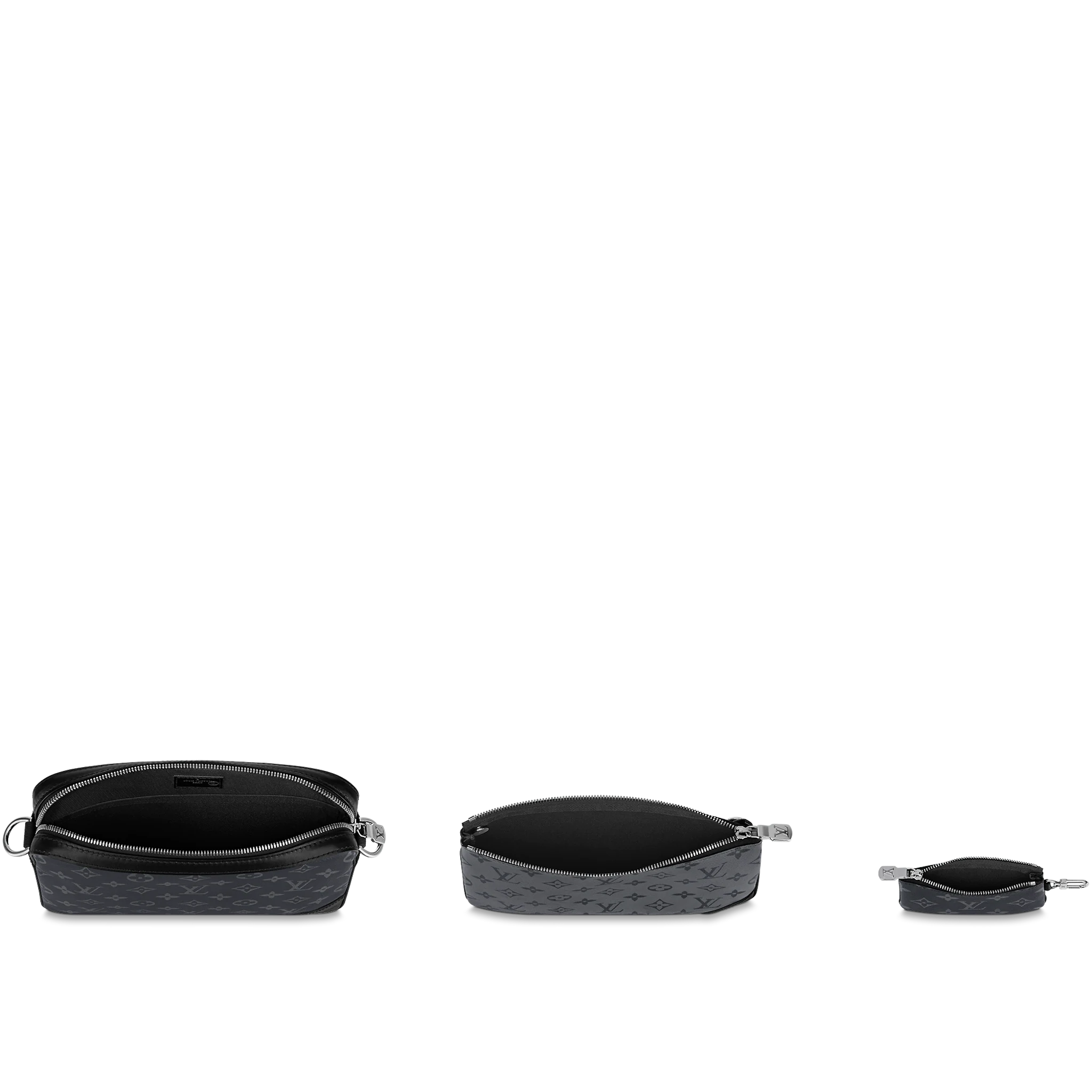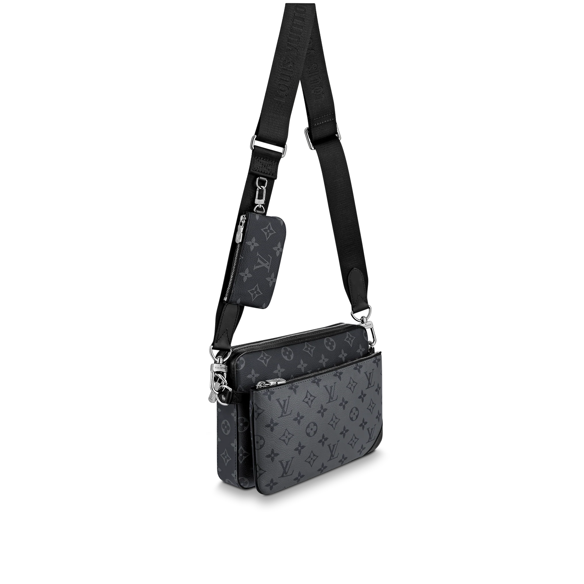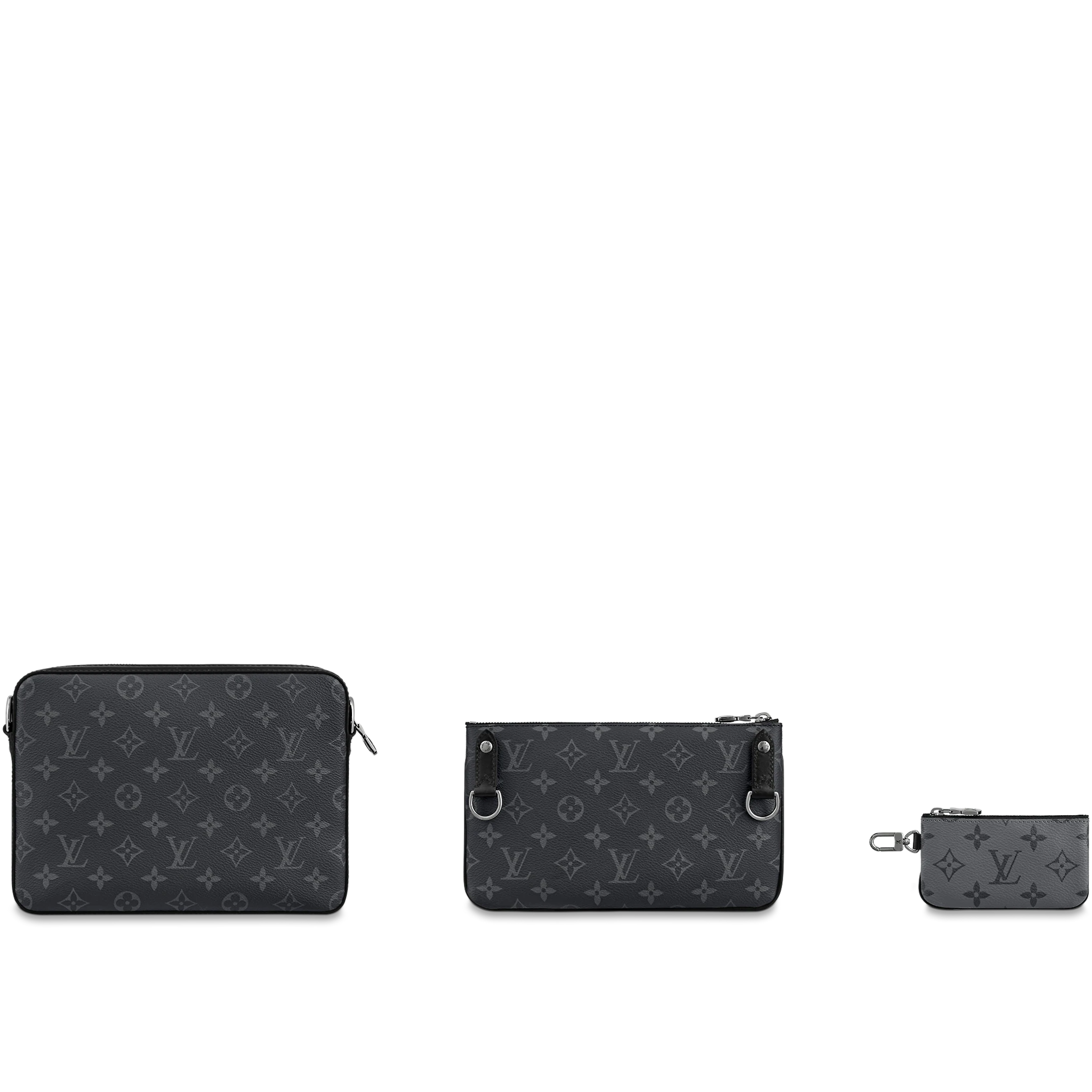 This item has very limited availability online and in select stores.The Trio Messenger bag for men is made from Monogram Eclipse canvas and its mirror twin, Monogram Eclipse Reverse. The iconic motif in tone-on-tone shades of gray complements the lines of this functional hybrid. More than a traditional cross-body bag, it has a removable zipped pocket and a removable coin purse attached to the strap