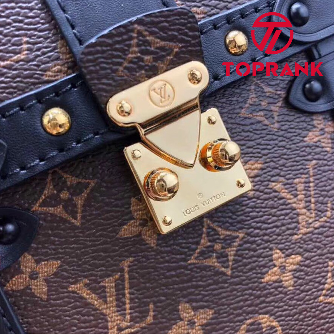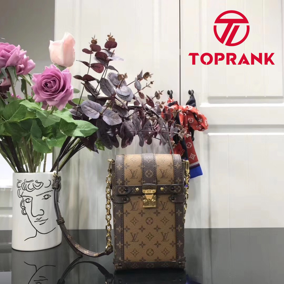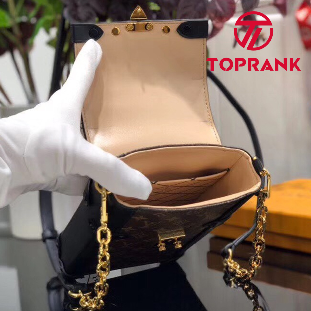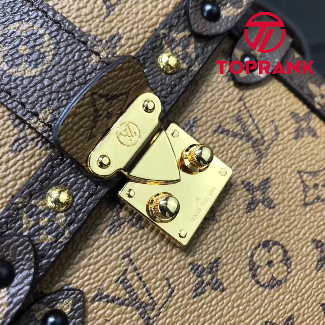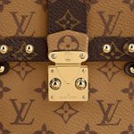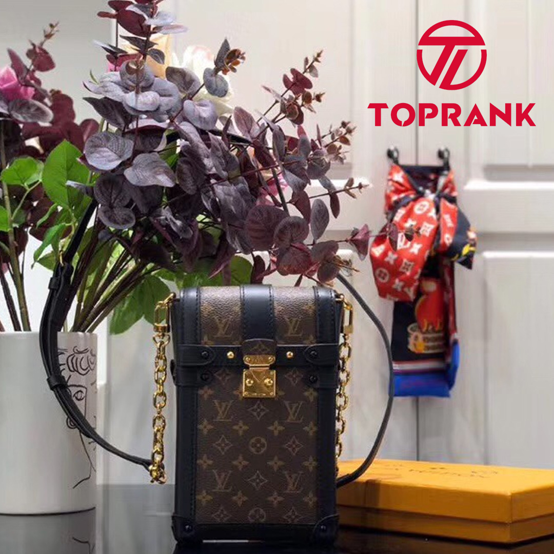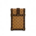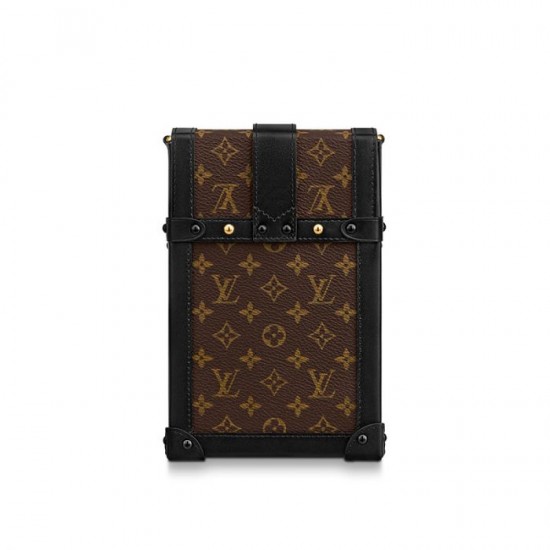 The Pochette Trunk Verticale is made from Monogram Reverse canvas with Monogram canvas trim and classic trunk details like the S-lock and malletage quilted interior. The adjustable strap is also removable to make this pouch a hand carried clutch or a mini bag worn crossbody. It easily holds two phones and a few cards.