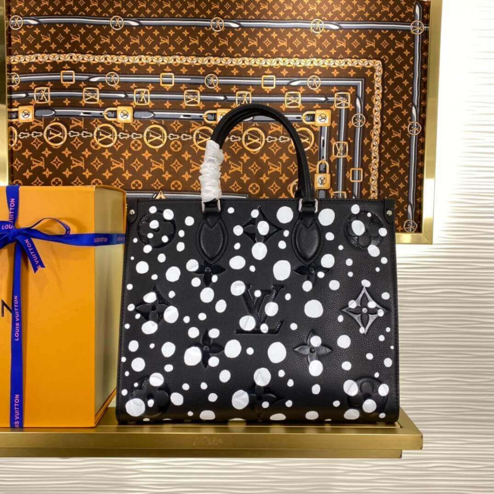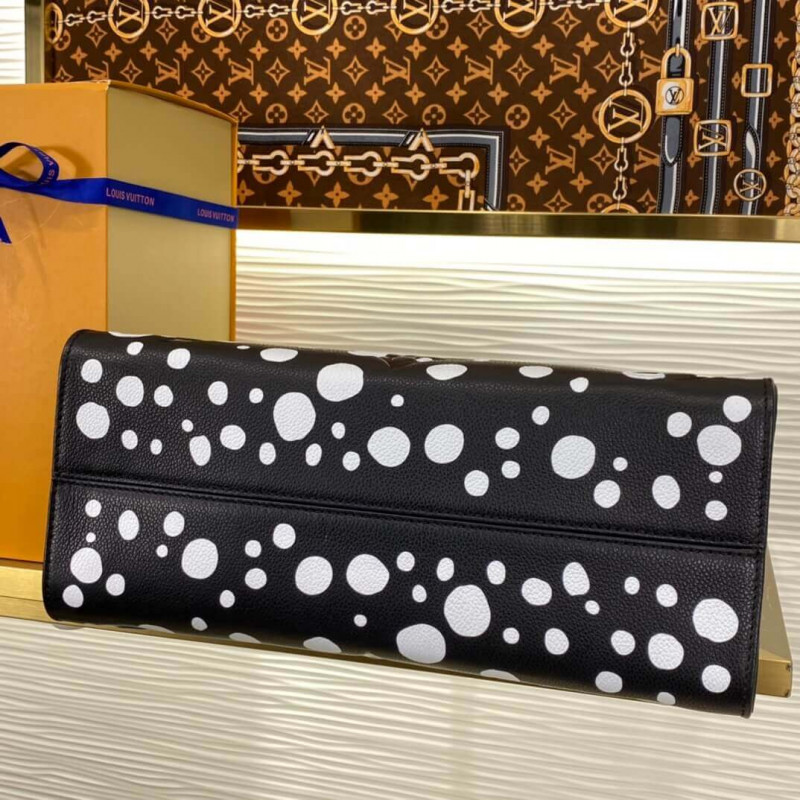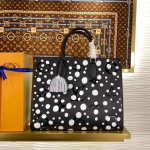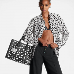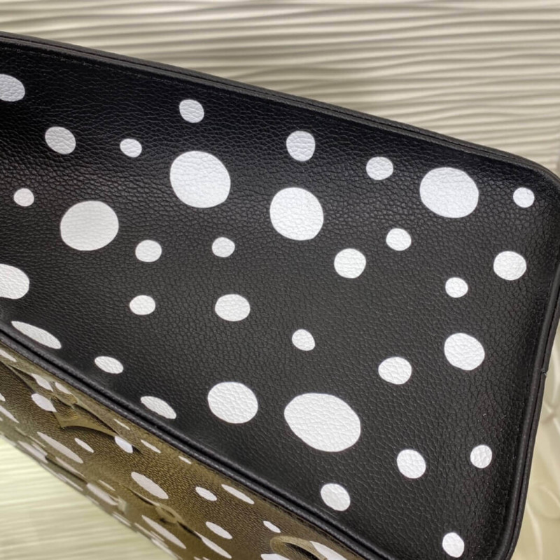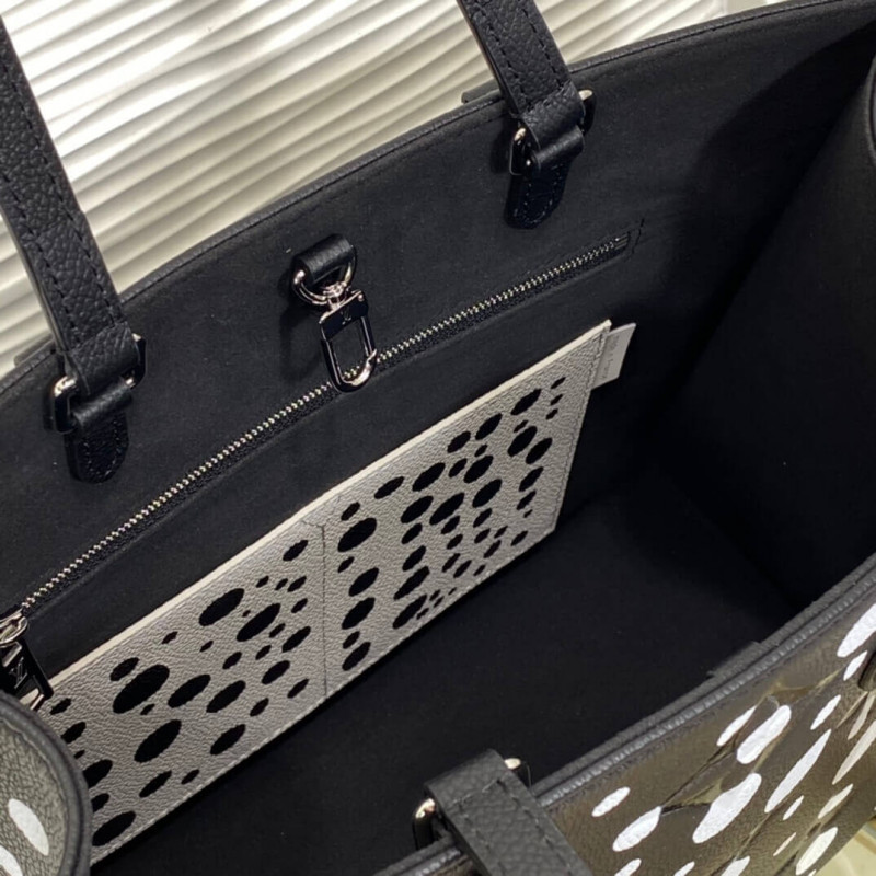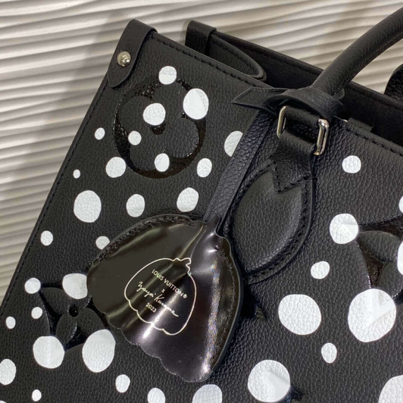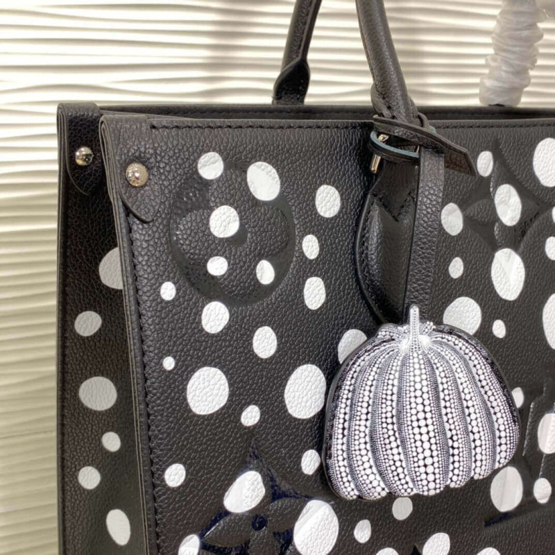 For the major new Louis Vuitton x Yayoi Kusama collection, the LVxYK OnTheGo MM comes decorated with the Japanese artist’s most recognizable signature: repetitive arrays of dots, a symbol of infinity. Dazzling white dots are printed on grained black cowhide embossed with one of the House’s own signatures, the iconic Monogram pattern. This spacious, practical tote comes with a charm shaped like a pumpkin, another recurrent theme in Kusama’s work.