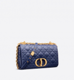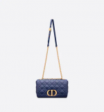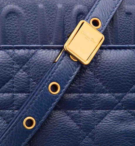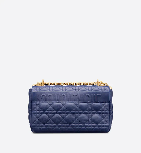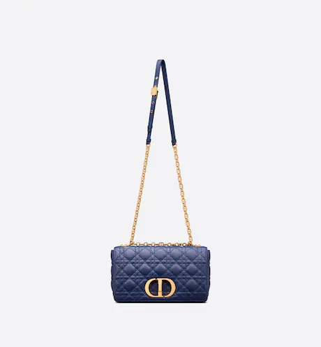 The Dior Caro bag combines modernity with timeless elegance. The silhouette is crafted in royal blue calfskin with Cannage topstitching. The supple bag features a flap adorned with an antique gold-finish metal ‘CD’ twist clasp, inspired by the seal of a Christian Dior perfume bottle. The detachable chain shoulder strap with ‘CD’ signature links allows the medium bag to be carried by hand or worn over the shoulder and may be replaced by one of the House’s wide embroidered straps for day or evening attire.