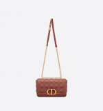 The Dior Caro bag combines modernity with timeless elegance. The design is crafted in rust-colored calfskin with Cannage stitching. The supple bag features a flap adorned with an antique gold-finish metal ‘CD’ twist clasp, inspired by the seal of a Christian Dior perfume bottle. The detachable chain strap with ‘CD’ signature links allows it to be carried by hand, worn over the shoulder or crossbody. It may be replaced by one of the House’s wide embroidered straps, allowing the medium bag to pair with day or evening attire.