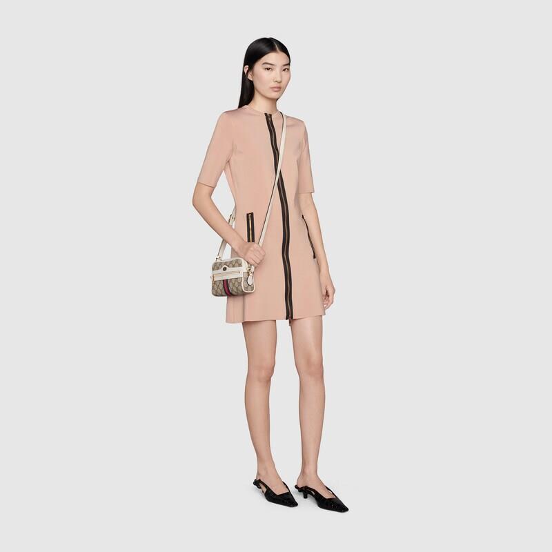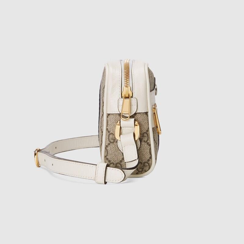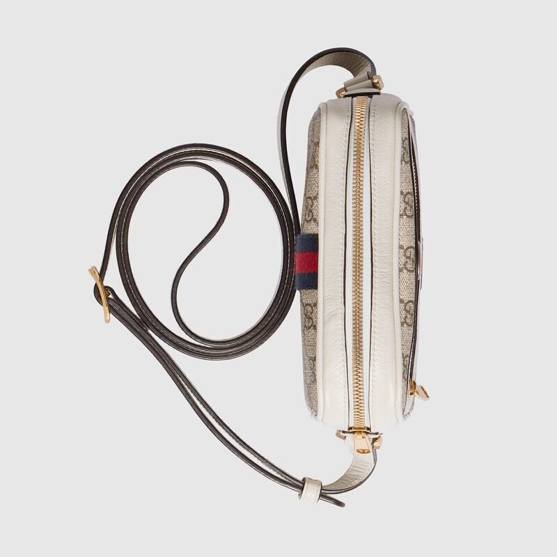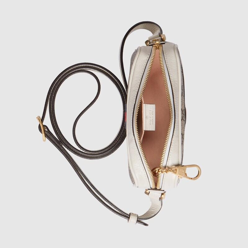 A new addition to the Ophidia collection is a structured mini bag with white leather trim. The GG logo evolved from the early Gucci diamond plaid pattern that began in the 1930s. It was first used in the 1970s and has since become a representative element of the Gucci collection.