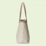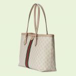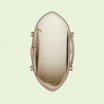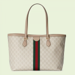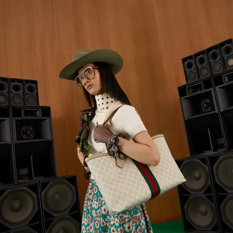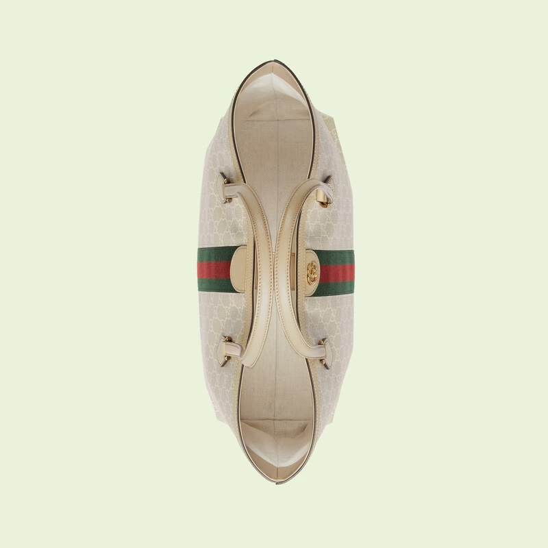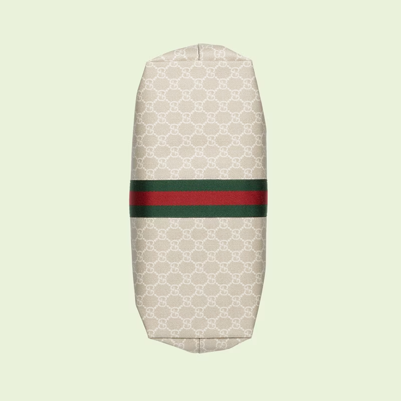 A heritage material from the archive, GG Supreme has been reimagined in Gucci Love Parade in different color combinations and combined with contemporary as well as classic styles. The Ophidia tote is presented in a beige and white variation of the signature material with a tonal trim. Originally a play on a ’30s design, the canvas speaks to the historical narrative that runs throughout the collection.