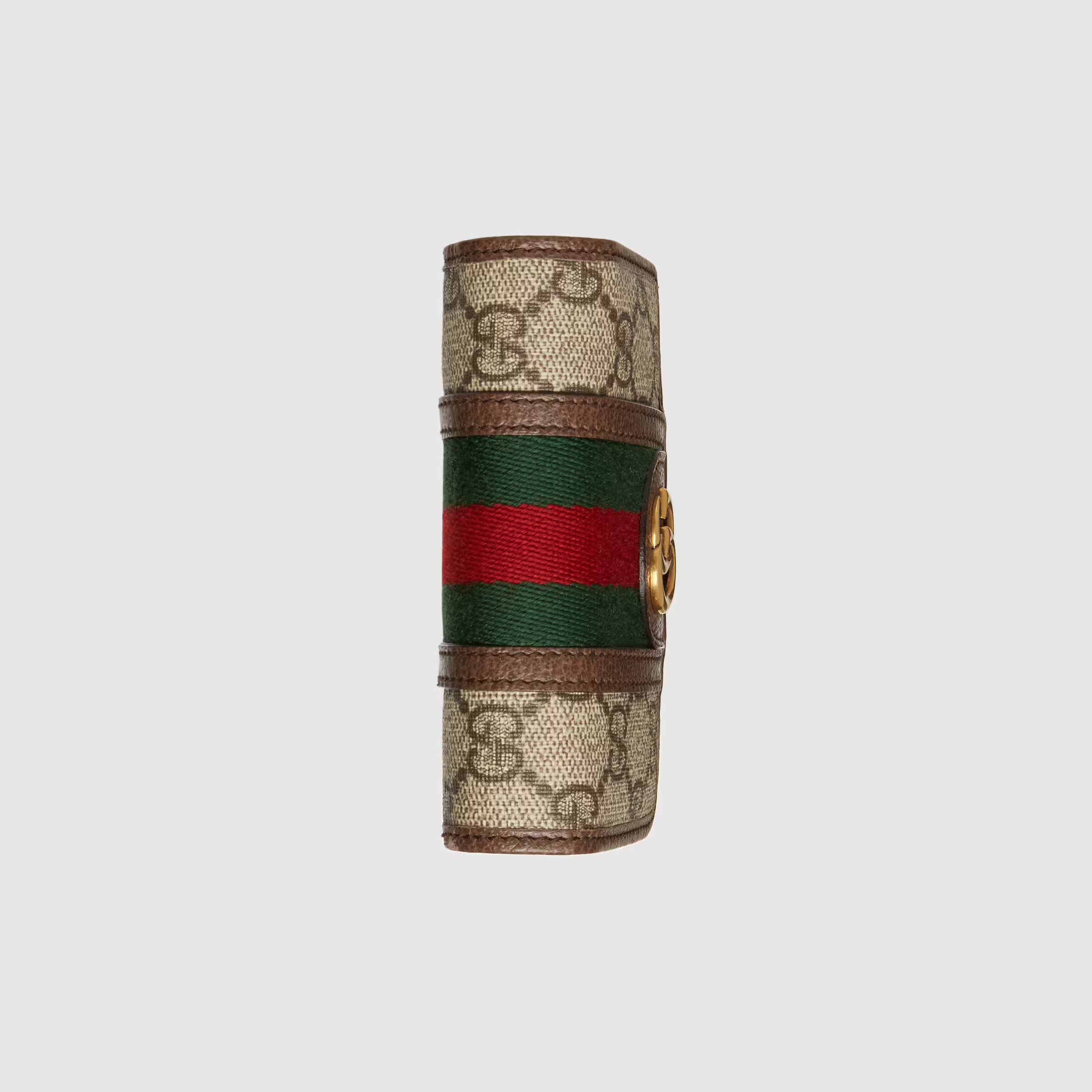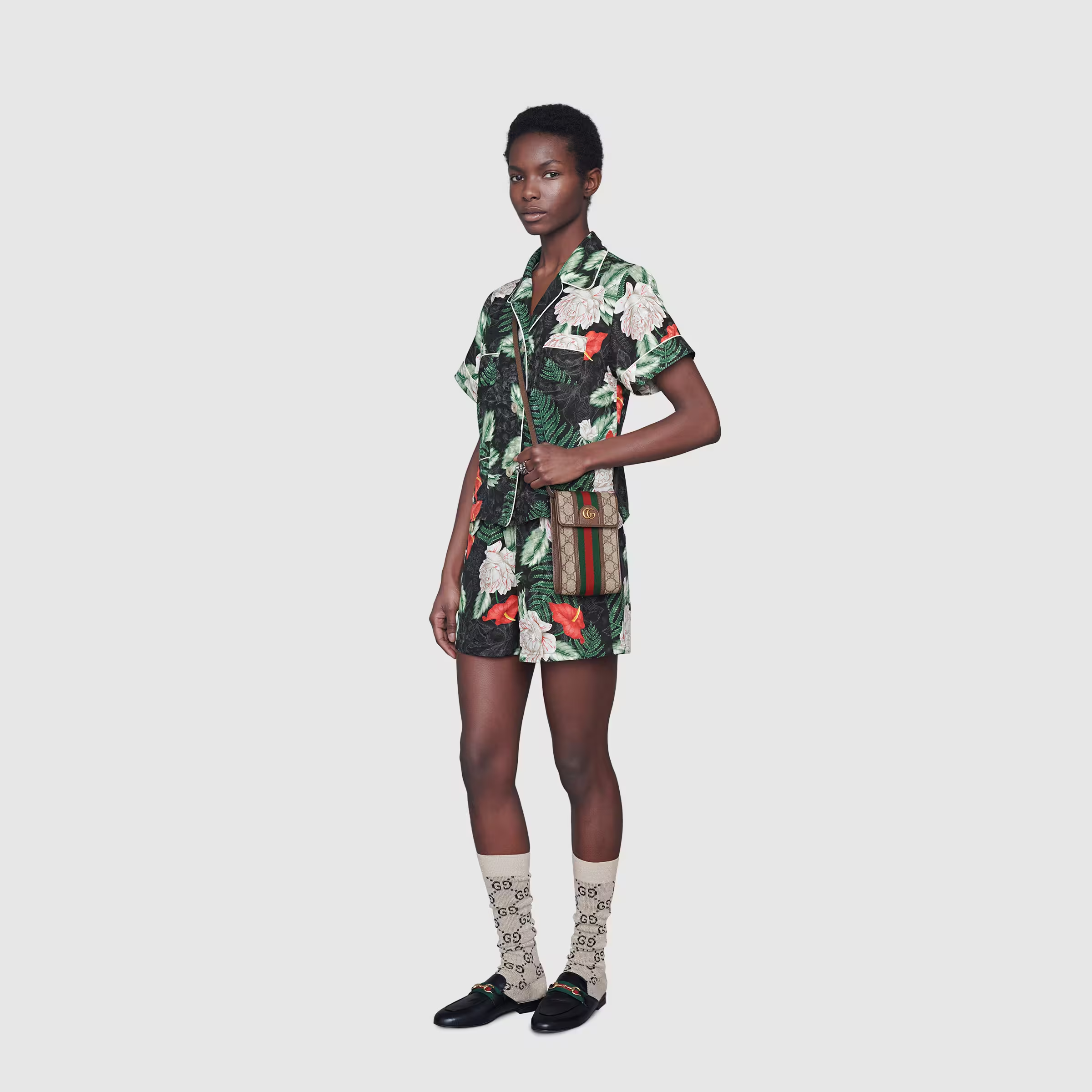 A new mini bag shape is presented within the Ophidia collection, with a magnetic flap closure and removable snap button shoulder strap. First developed by Gucci in the 1950s, the Web stripe continues to pay homage to the House’s roots and equestrian influences, inspired by the strap that secured the saddle to the horse. Portrayed in its most notable combination of green and red, the stripe runs down the centre of the petite, rectangular shape in GG Supreme canvas. The style can be used as a phone bag.