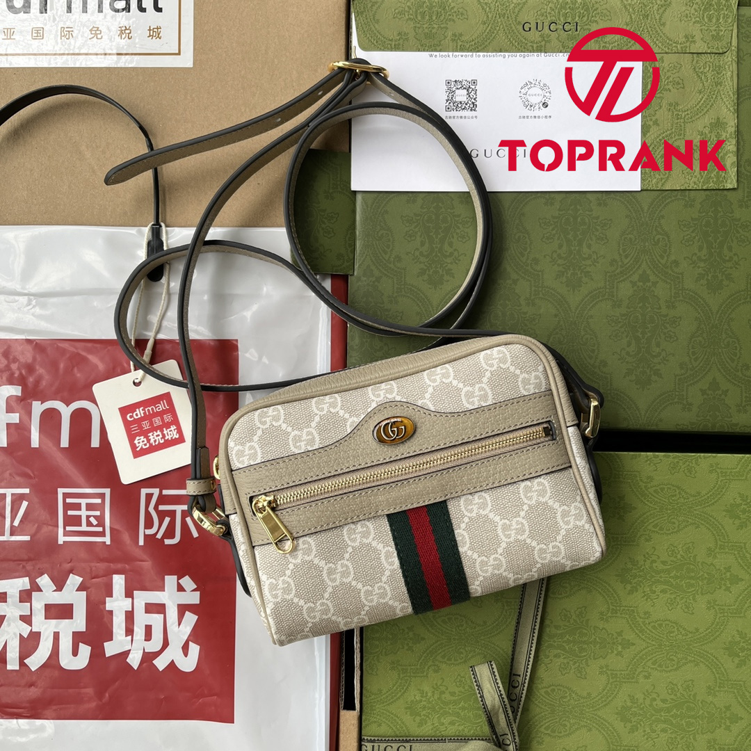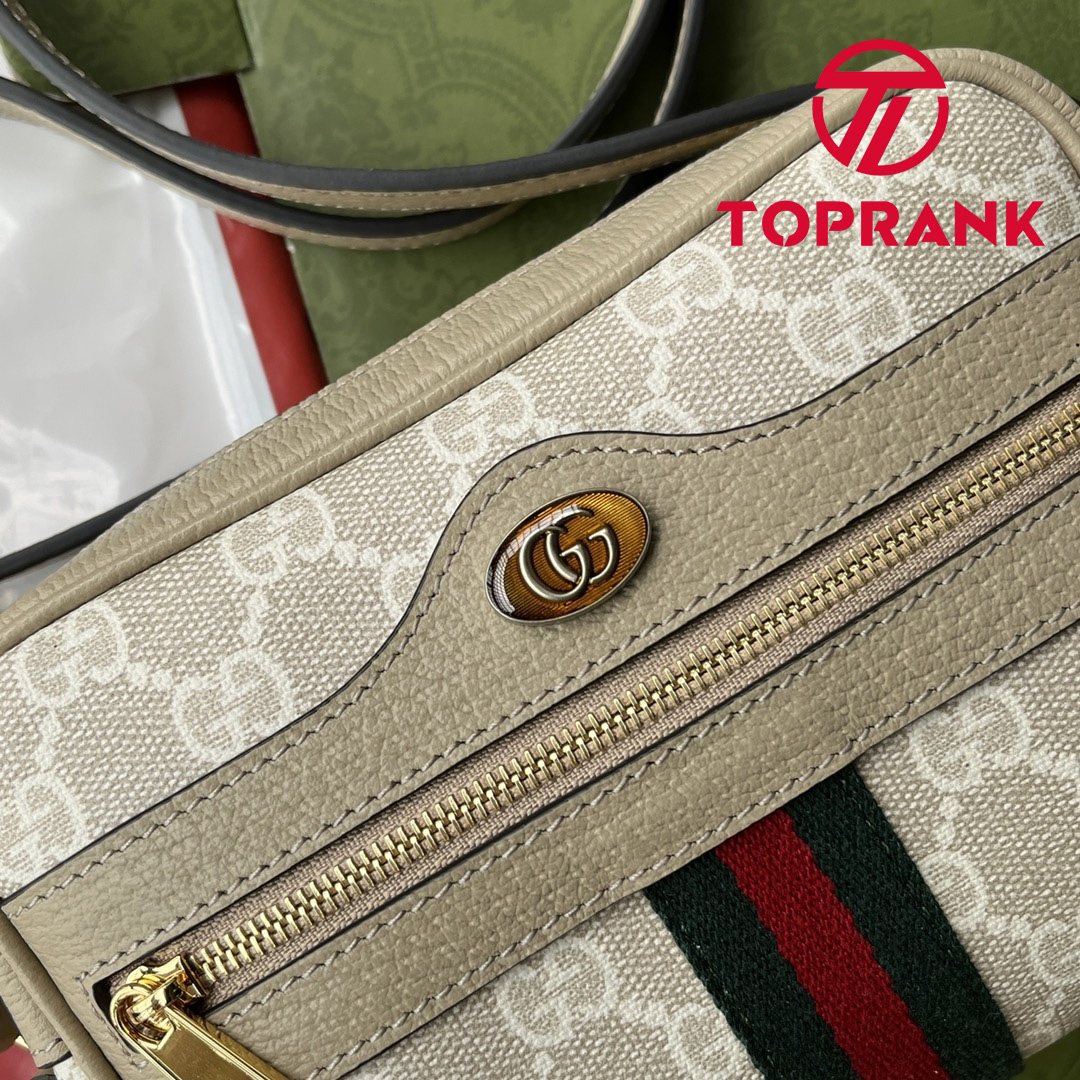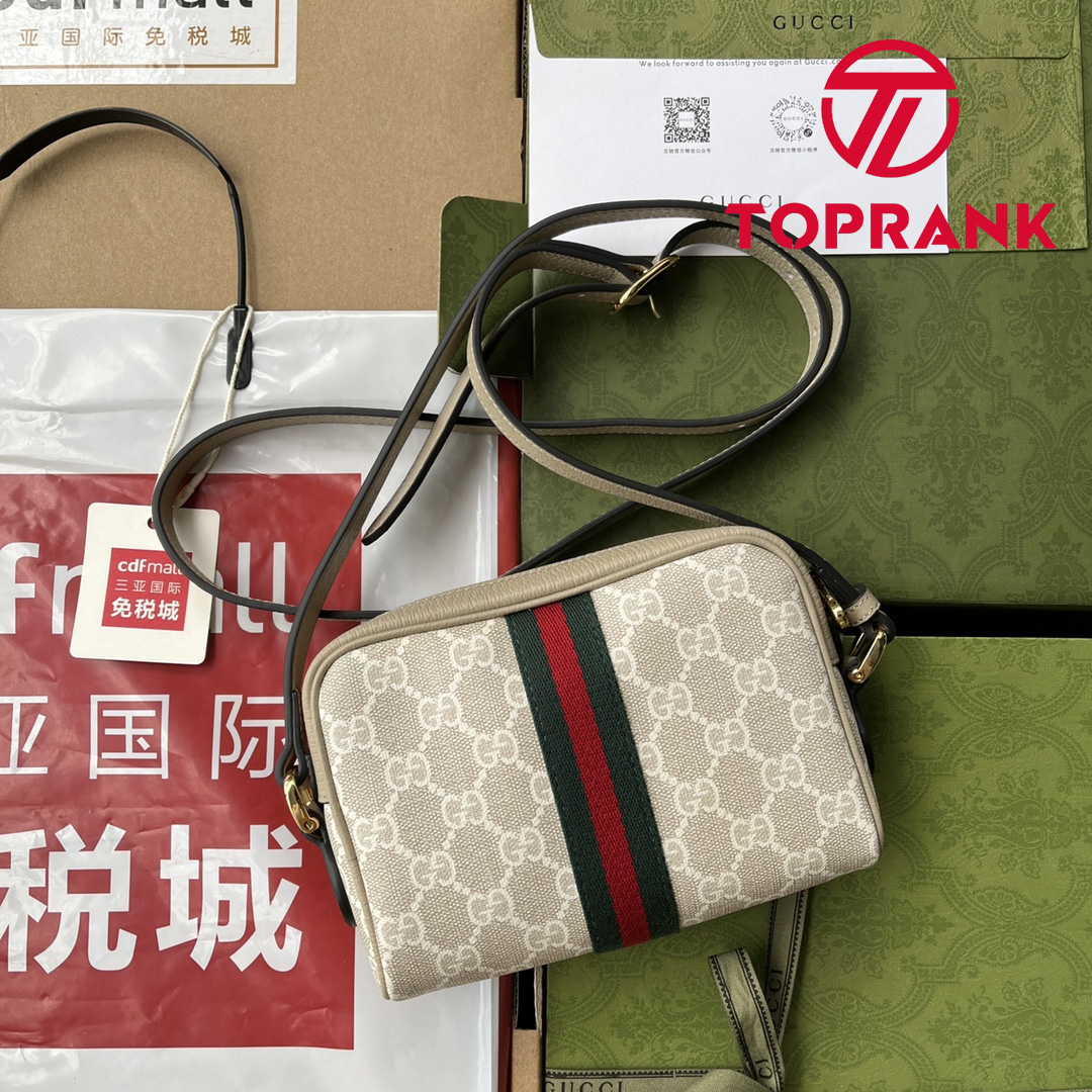 Within Gucci Love Parade the world of Ophidia evolves with new iterations, combining vintage inspired details with emblematic House codes. This mini bag is crafted from beige and white GG Supreme Canvas, with a distinctive white leather trim and inlaid green and red Web stripe. The Double G completes the style.