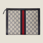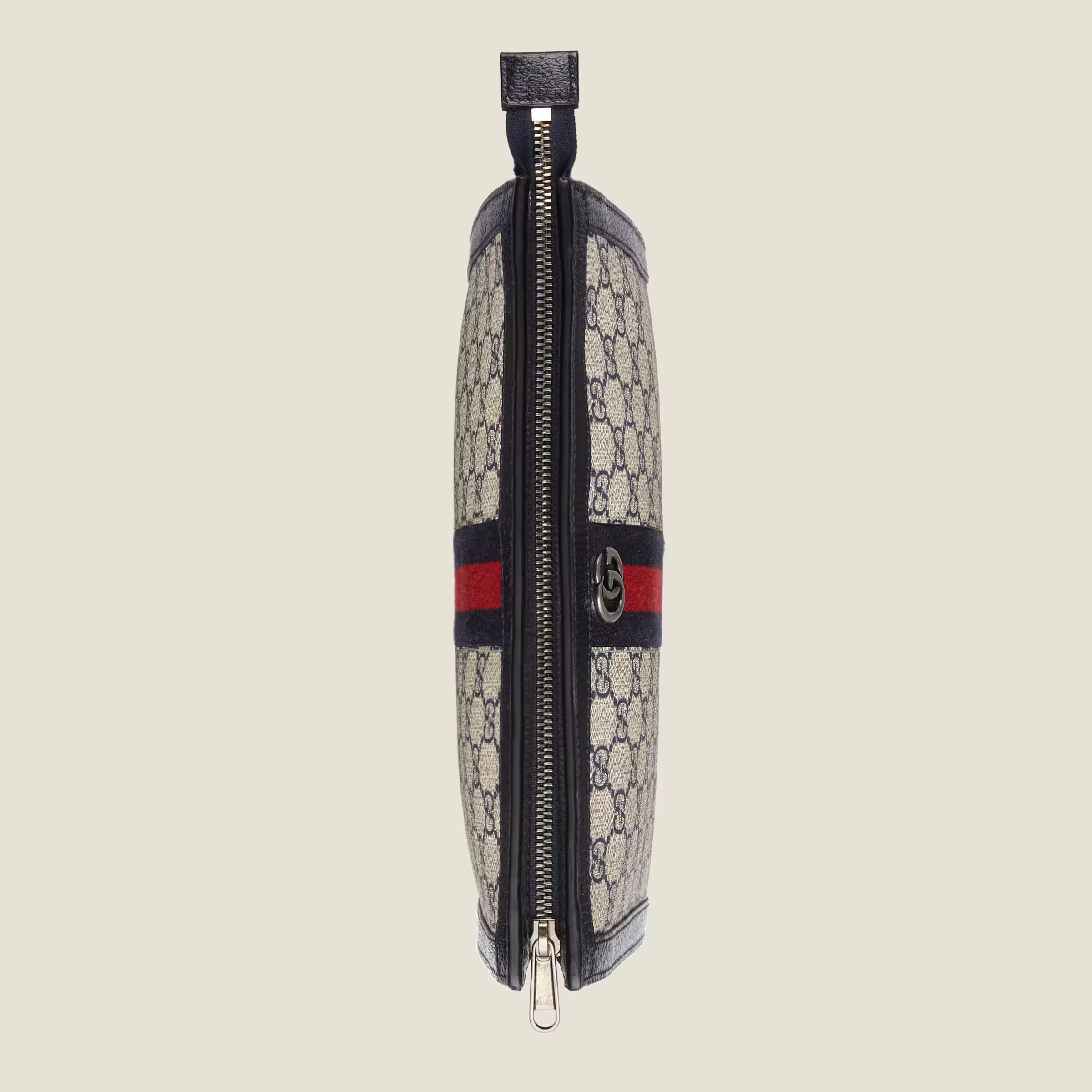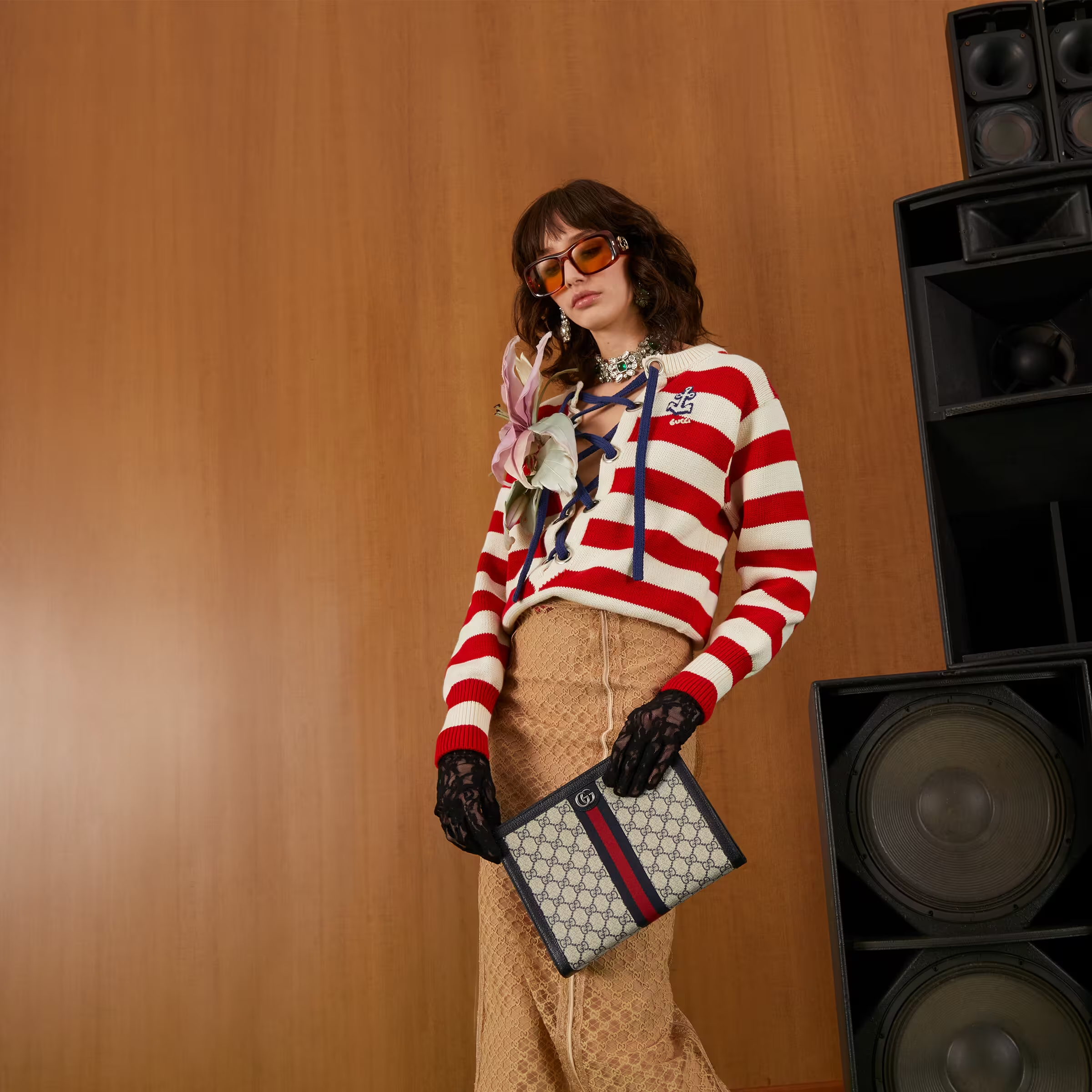 Mirroring the material’s historic origins, GG Supreme is introduced in a timeless mix of blue and beige for Gucci Love Parade. The canvas has come to the front of each collection decade after decade to become a hallmark of the House. Here, the classic palette defines this slim Ophidia pouch.